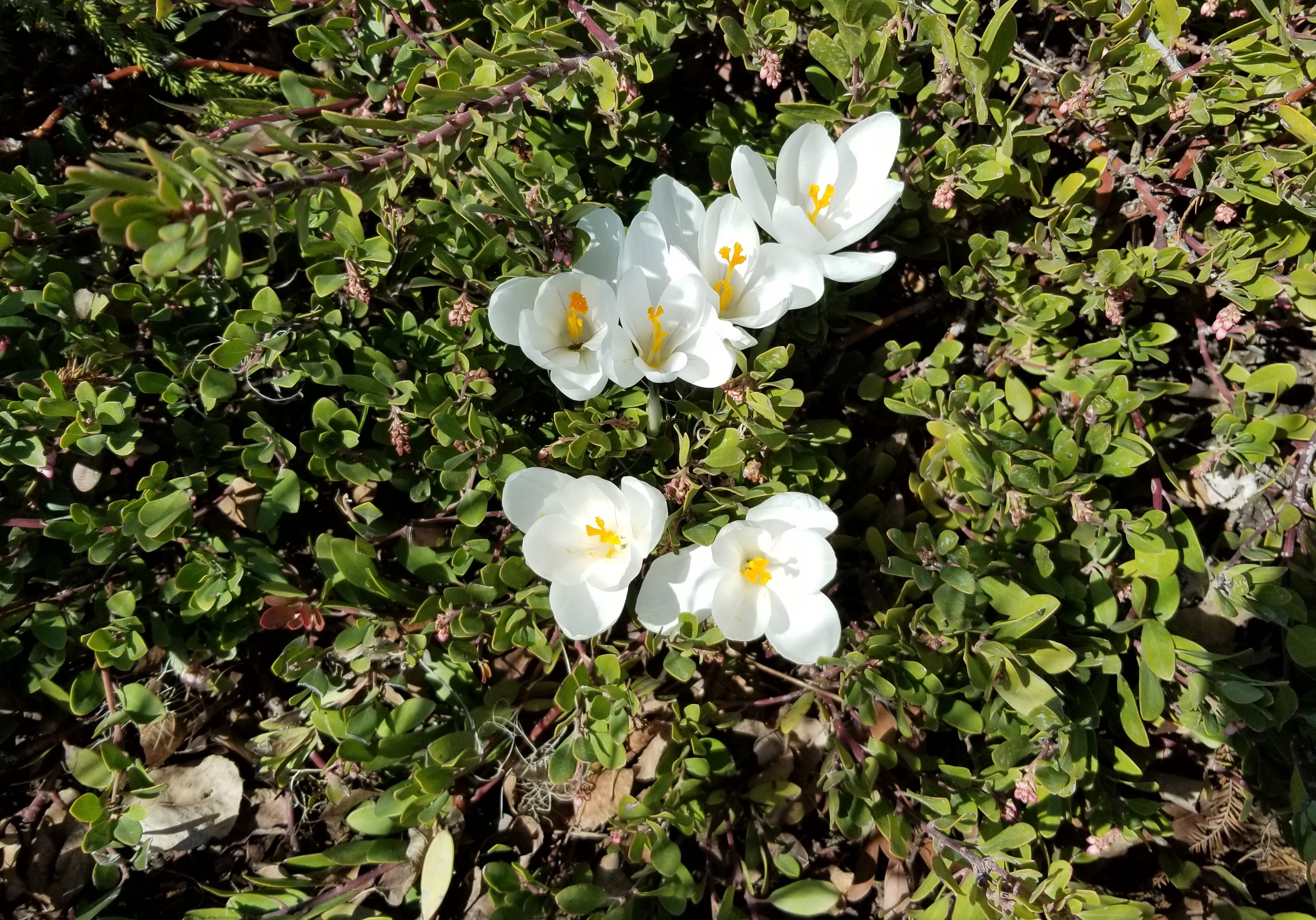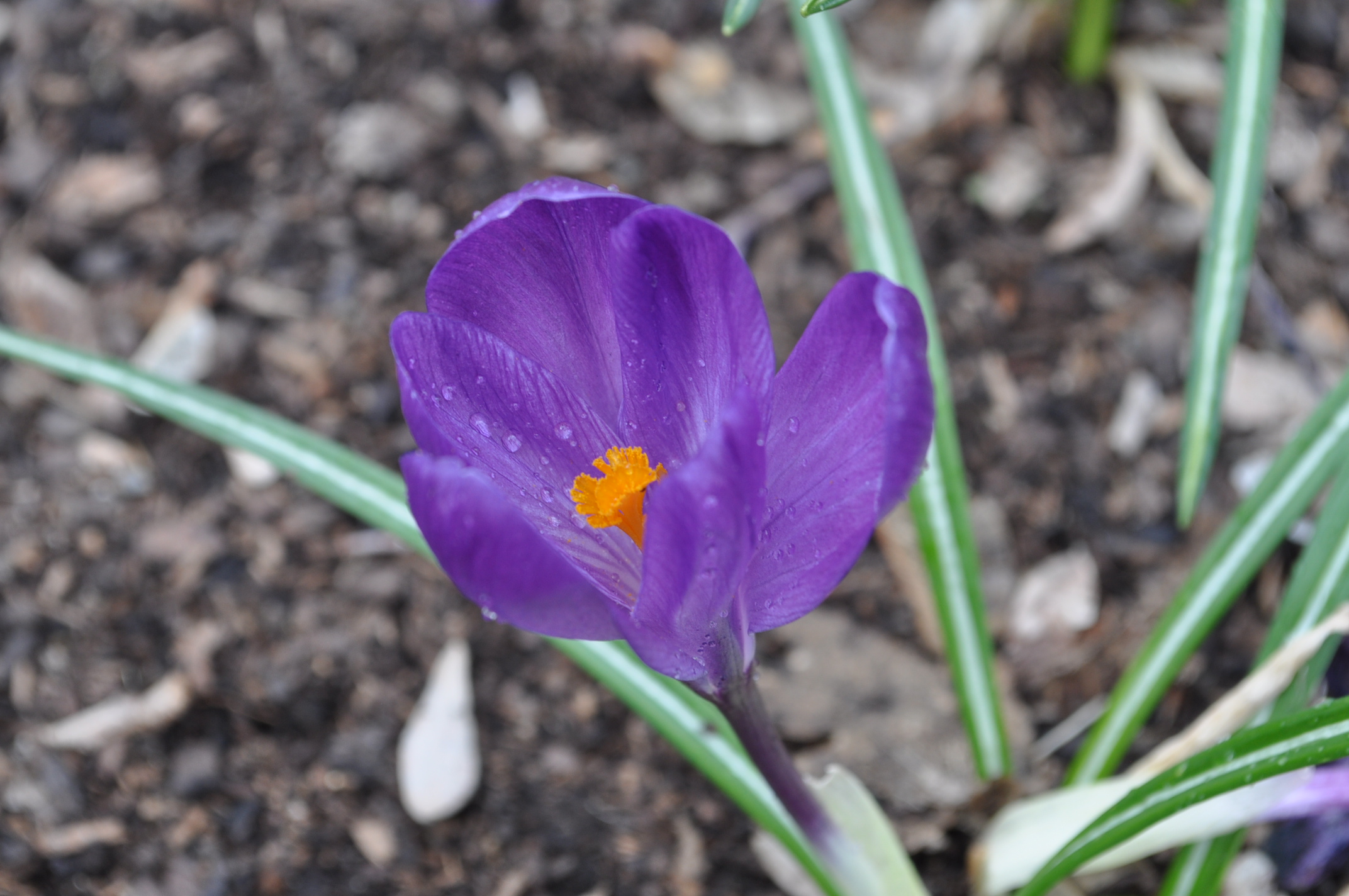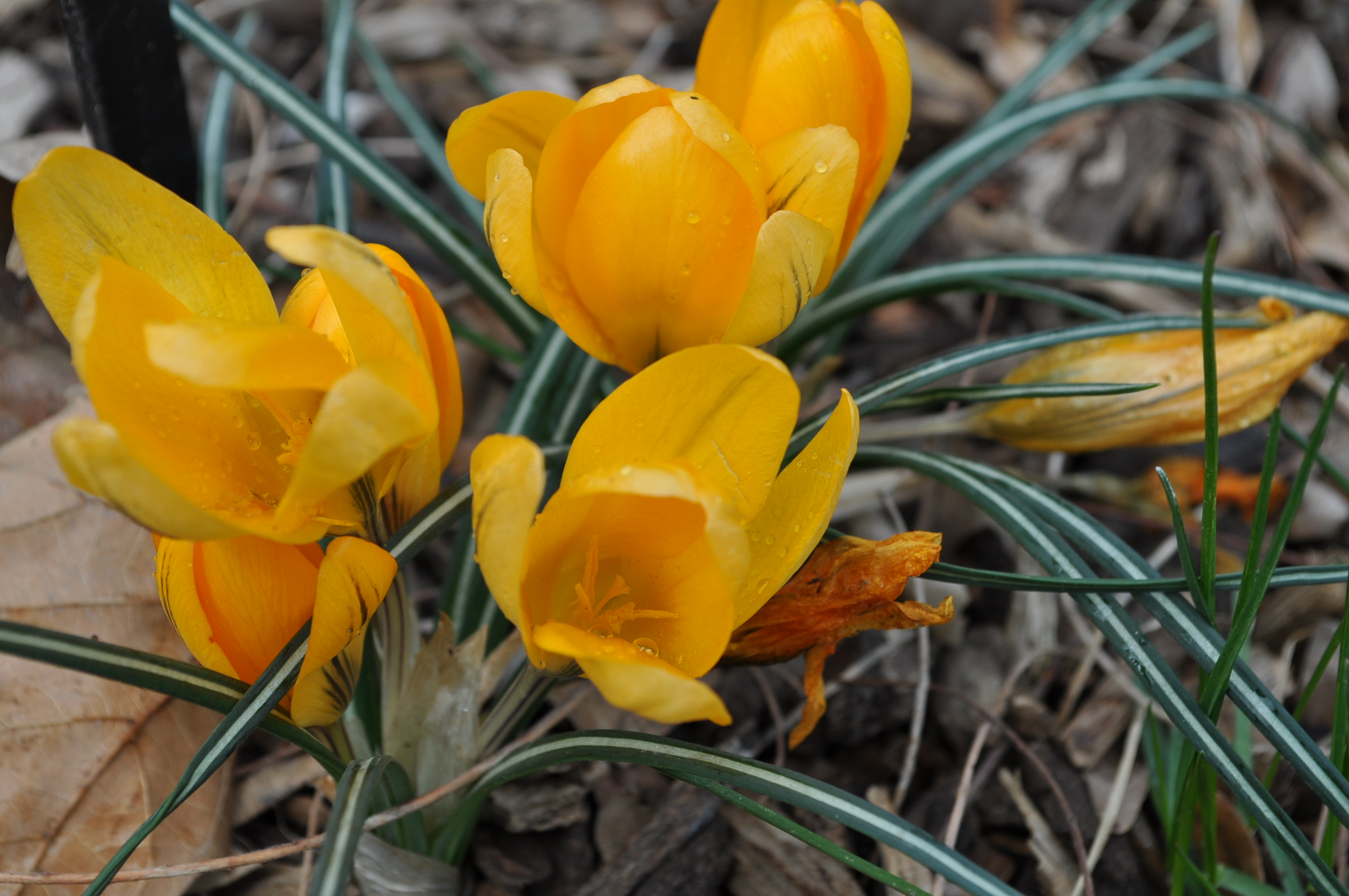 Plant Description: This small flower is one of the first bloomers of spring. Large white, purple or yellow cup shaped flowers grow over grass-like leaves with white midribs. Plant in fall. Species at the garden include Snow Crocus (Crocus chrysanthus) and Spring Crocus (Crocus vernus).