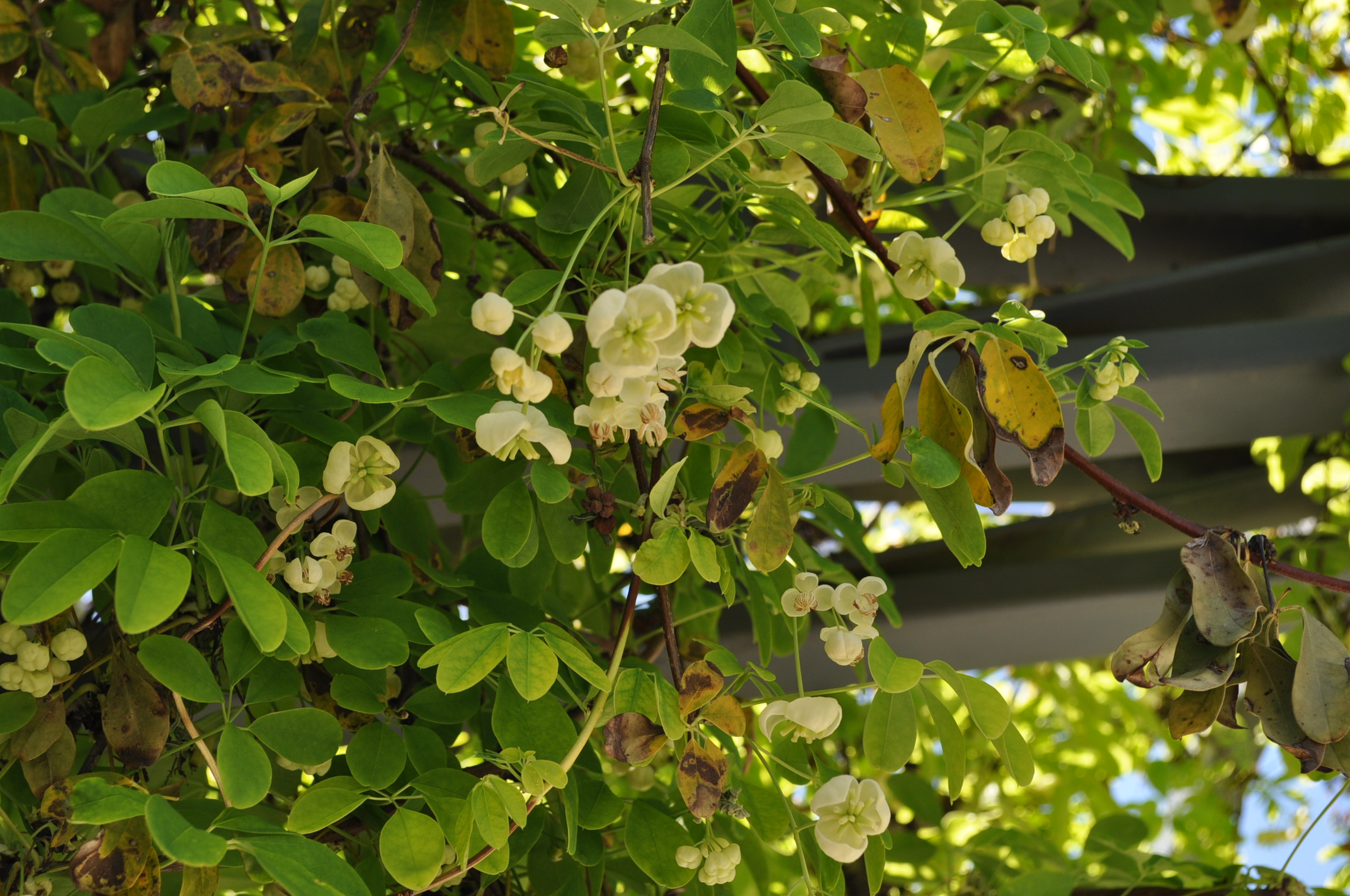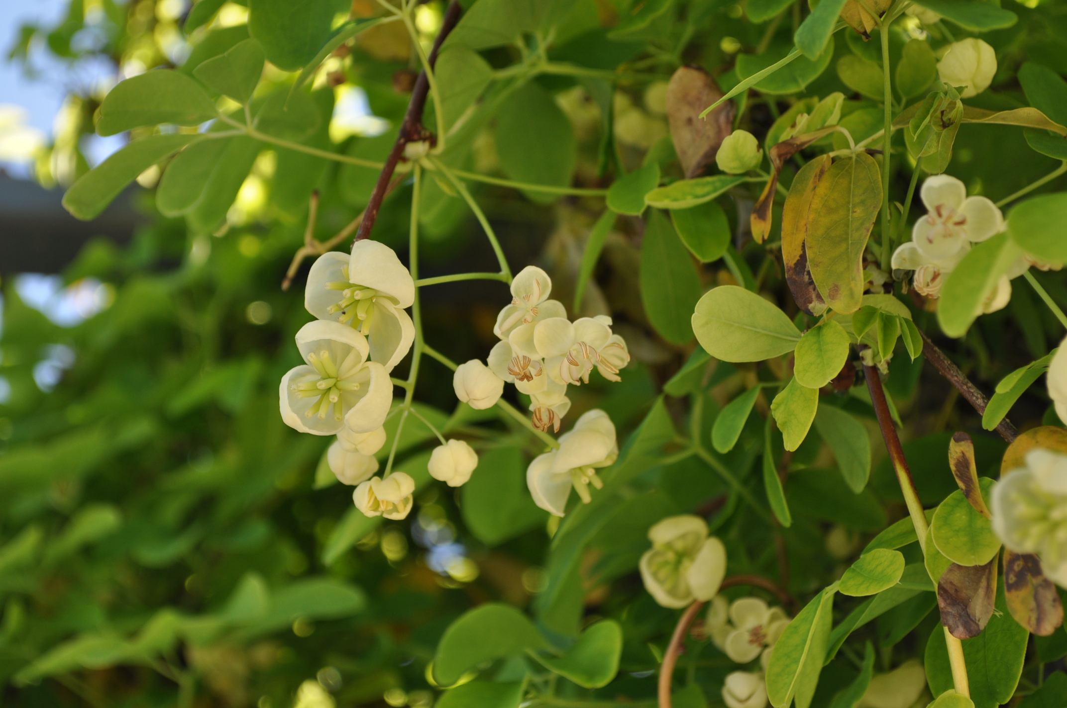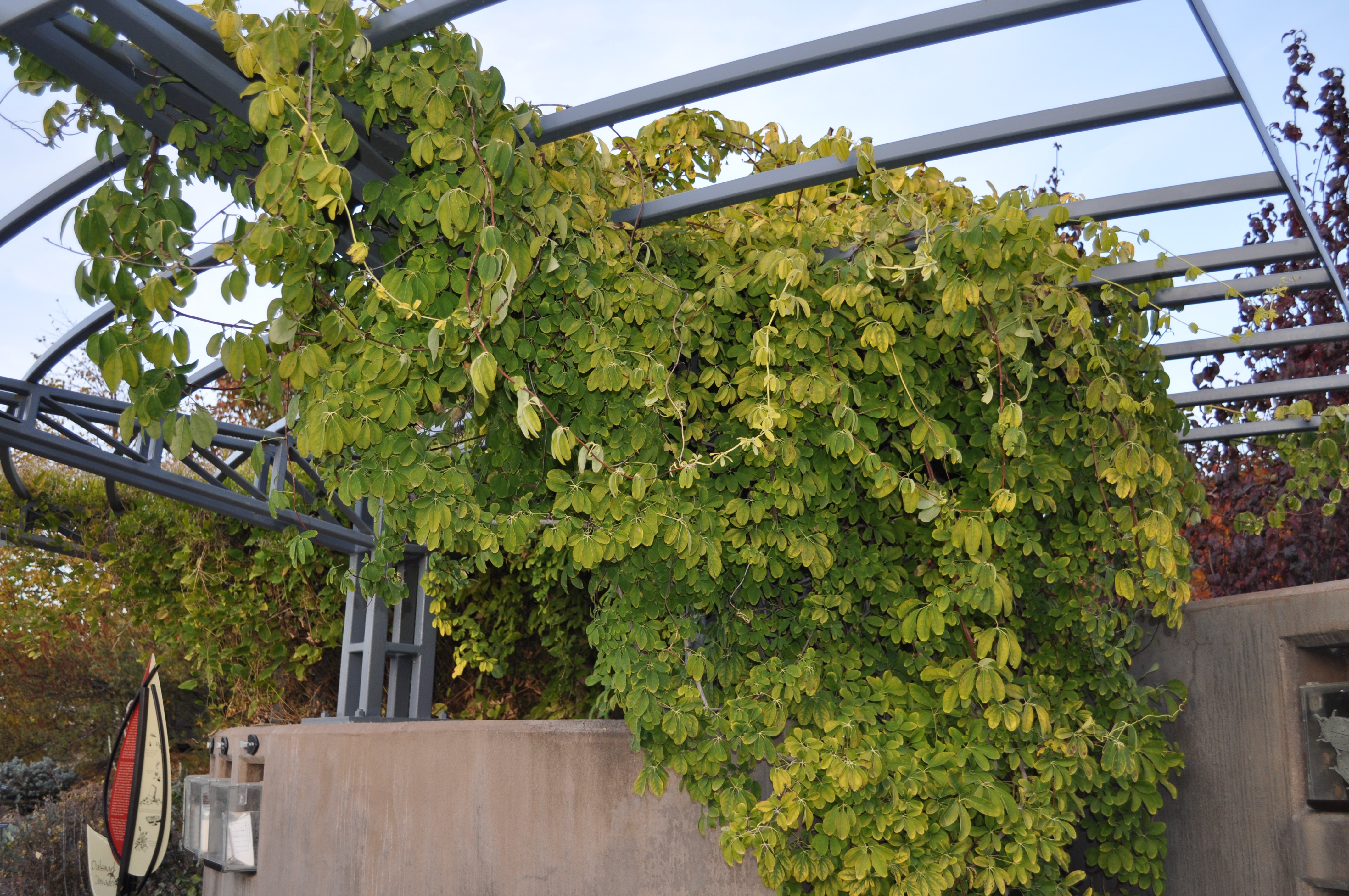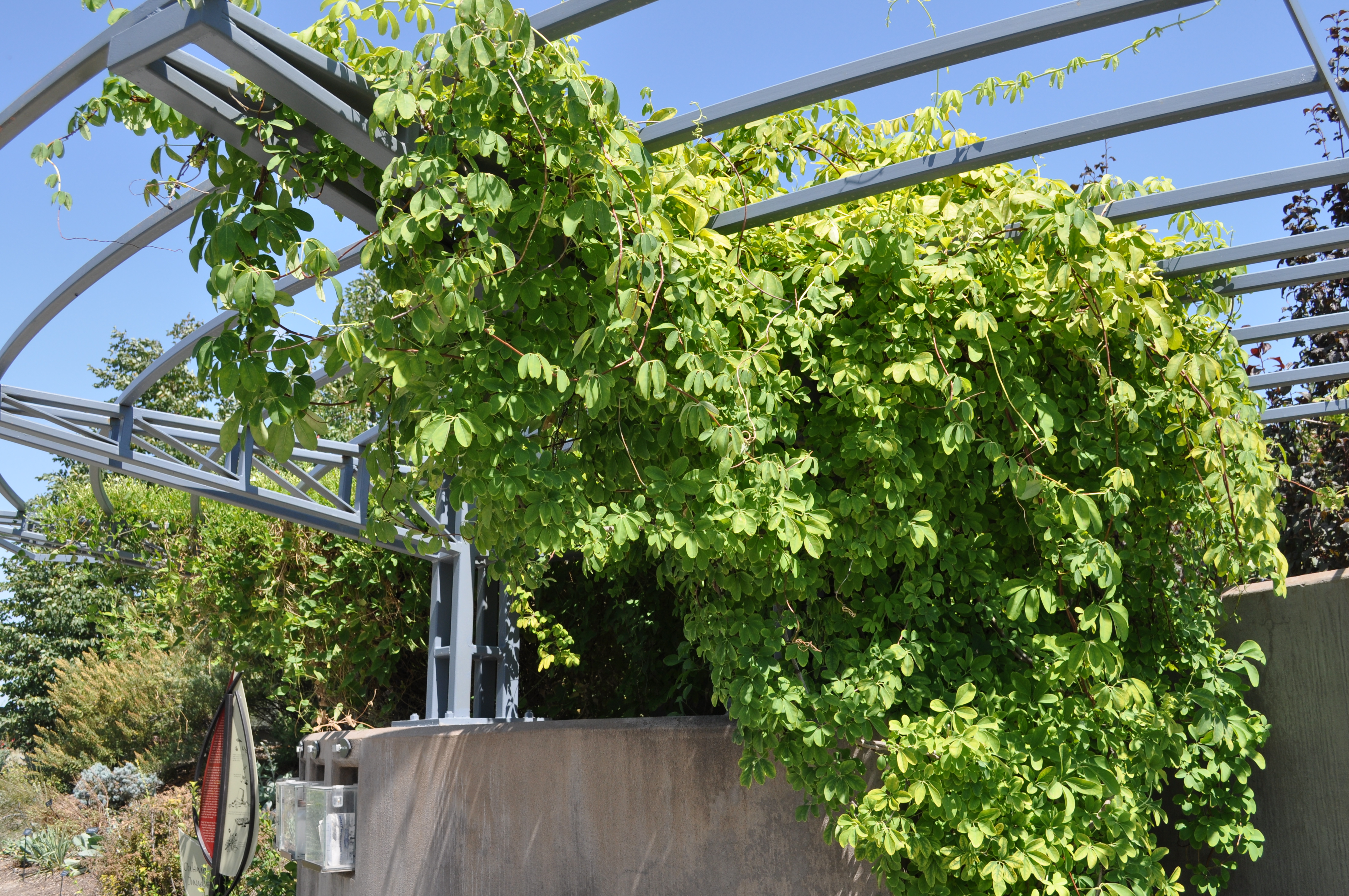 Plant Description: A semi-evergreen vine with pretty, light green leaves of 5 leaflets. Spicy-scented white flowers appear in clusters in the spring, followed by 4” long purple fruit with edible white pulp in late summer. It wraps around and cascades down beautifully on structures, adding movement and interest to trellises and arbors. It can grow vigorously and become invasive in wetter climates. This plant may not produce a lot of fruit without hand pollination.