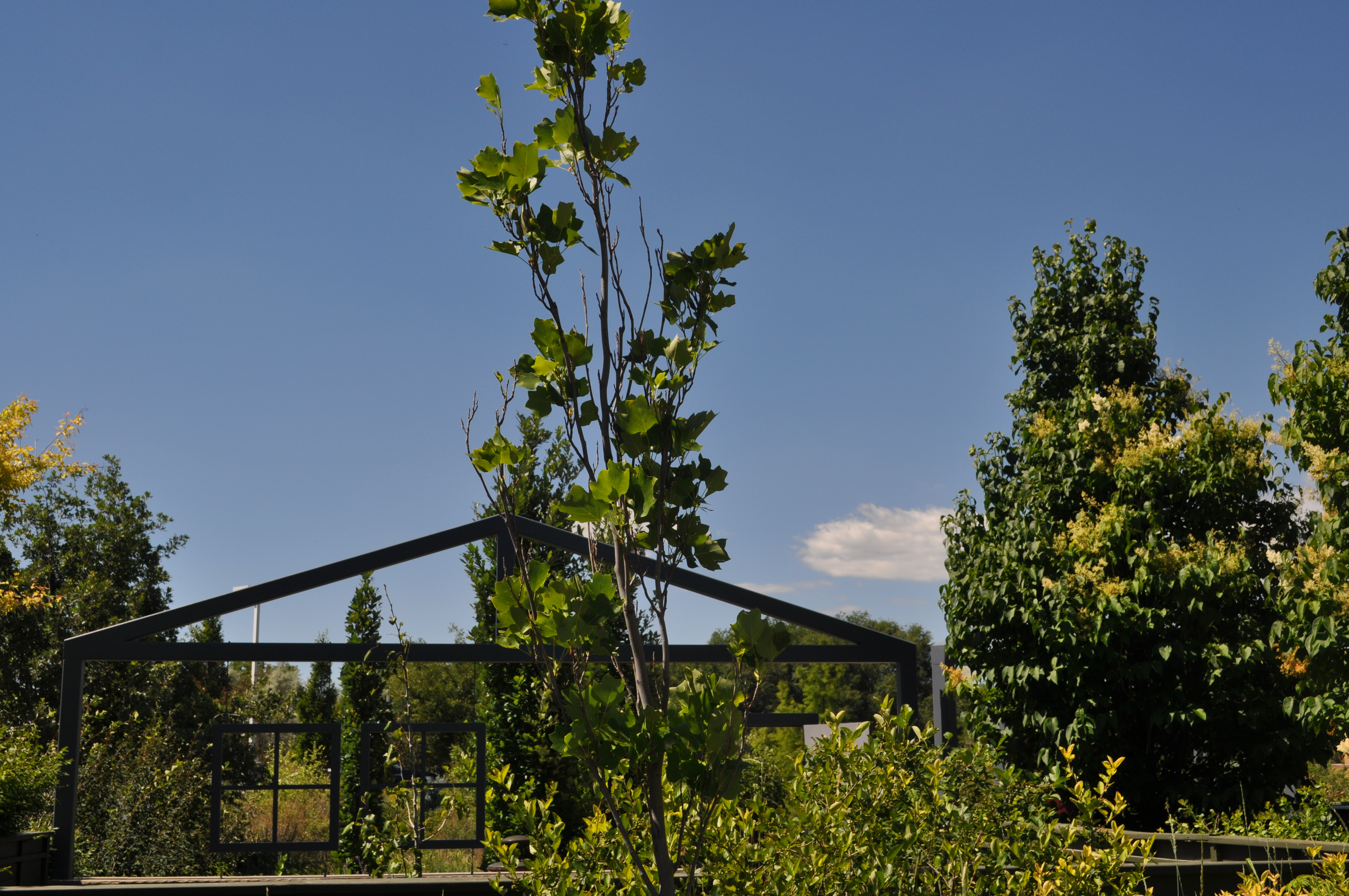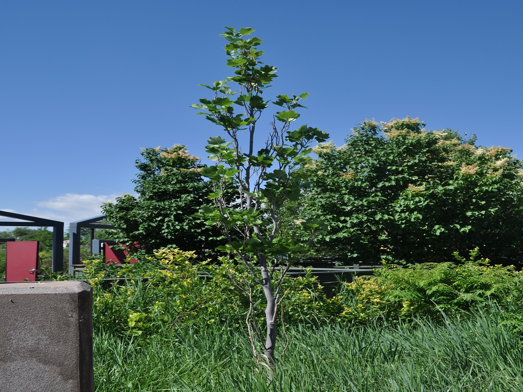 Plant Description: A deciduous tree that is tightly columnar. Its leaves have four lobes and are brightly green. Yellow flowers bloom in mid-spring and look like tulips.