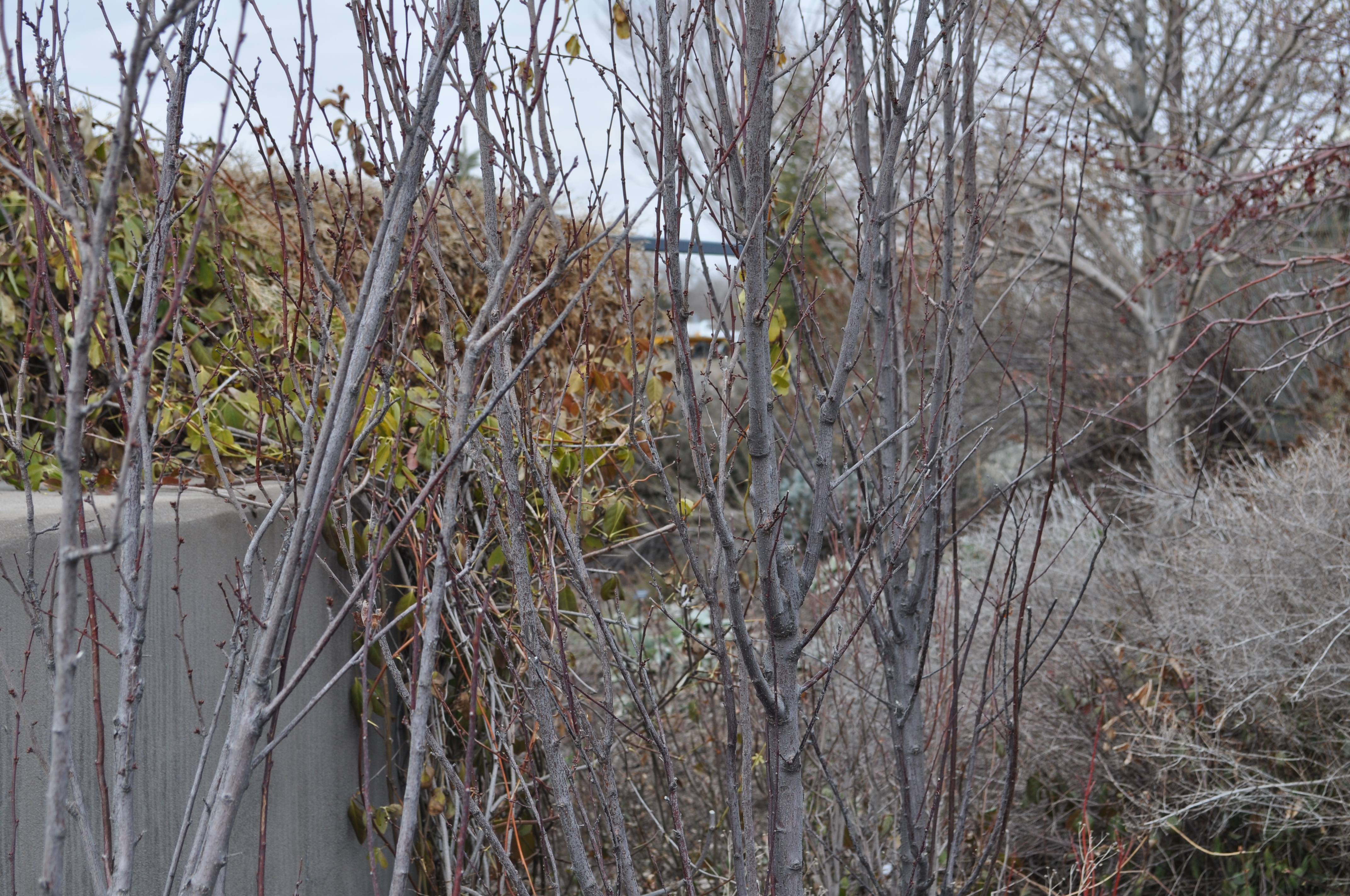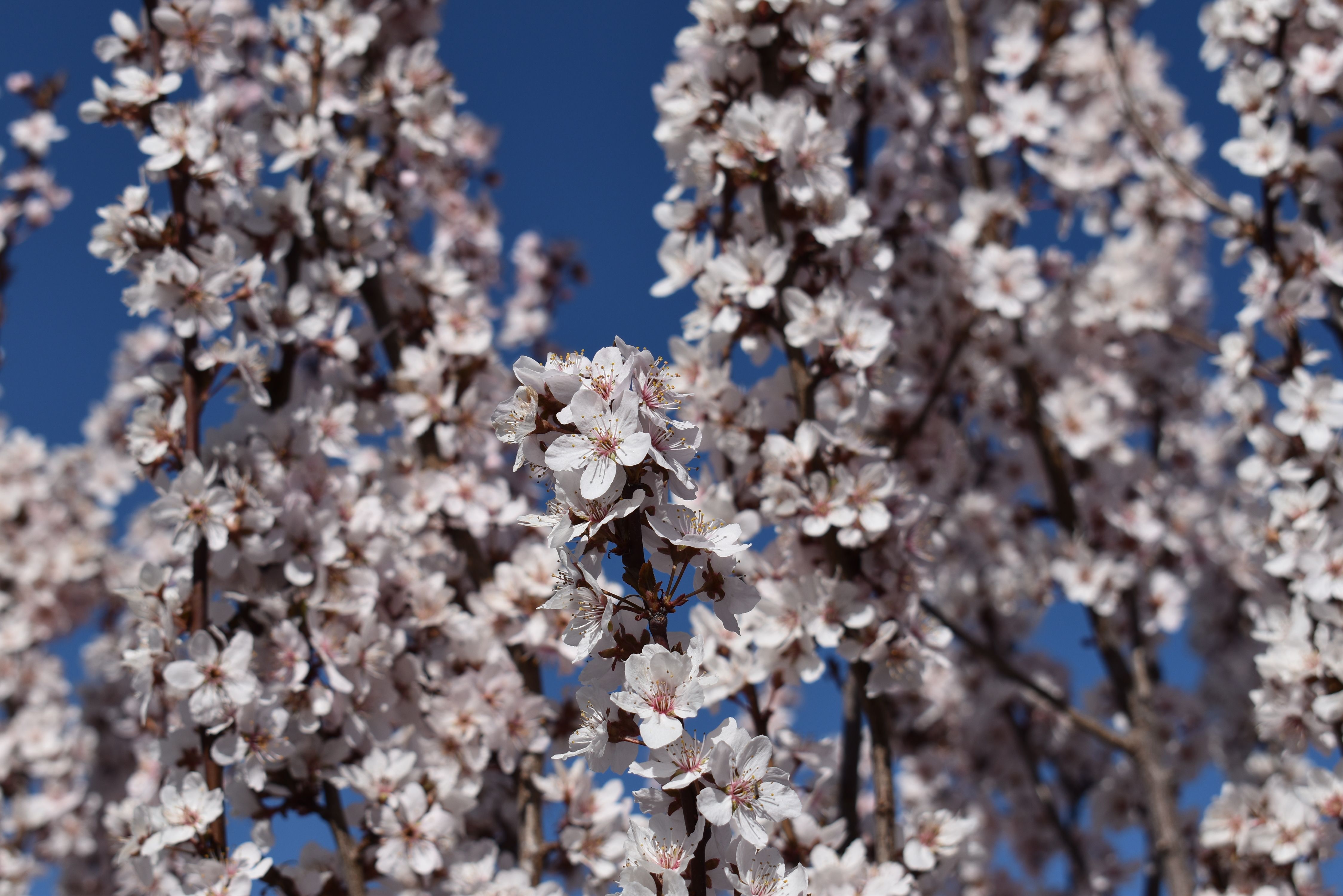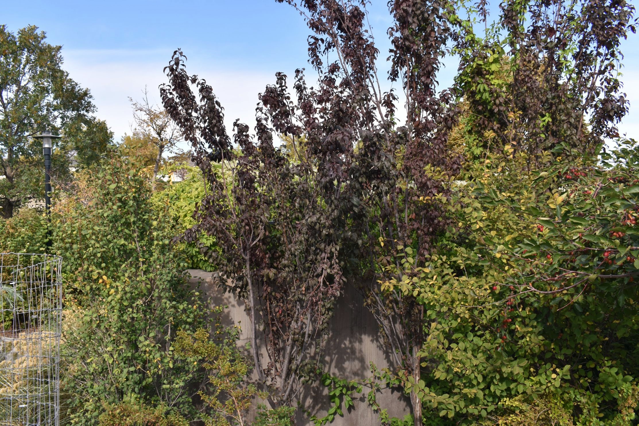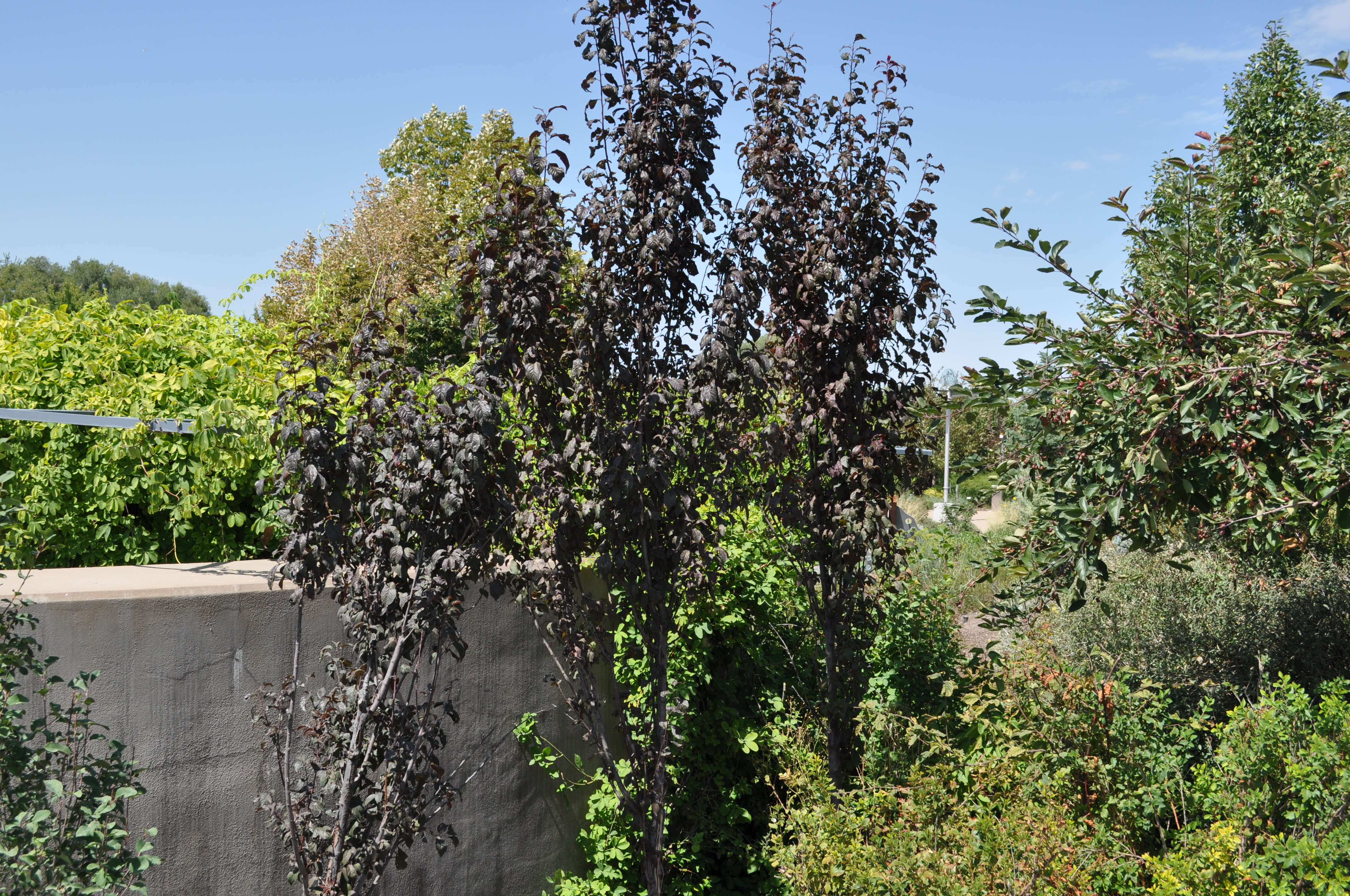 Plant Description: A columnar, narrow form, this flowering plum has white flowers that coat the branches in spring. The showy foliage is glossy bronze-maroon. Following the white flowers, small edible ornamental fruits carry into summer. Makes a great screening plant for narrow spaces.