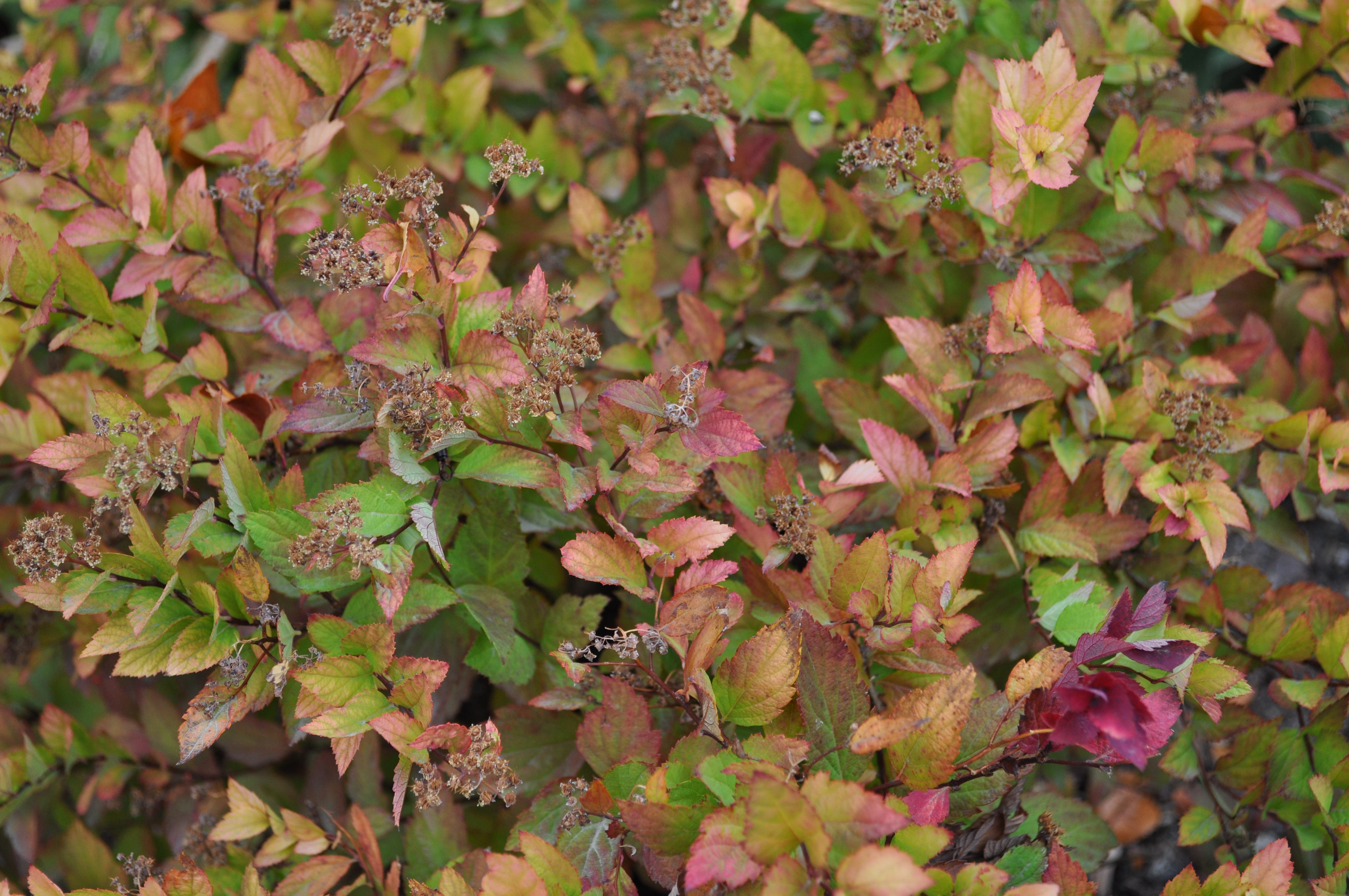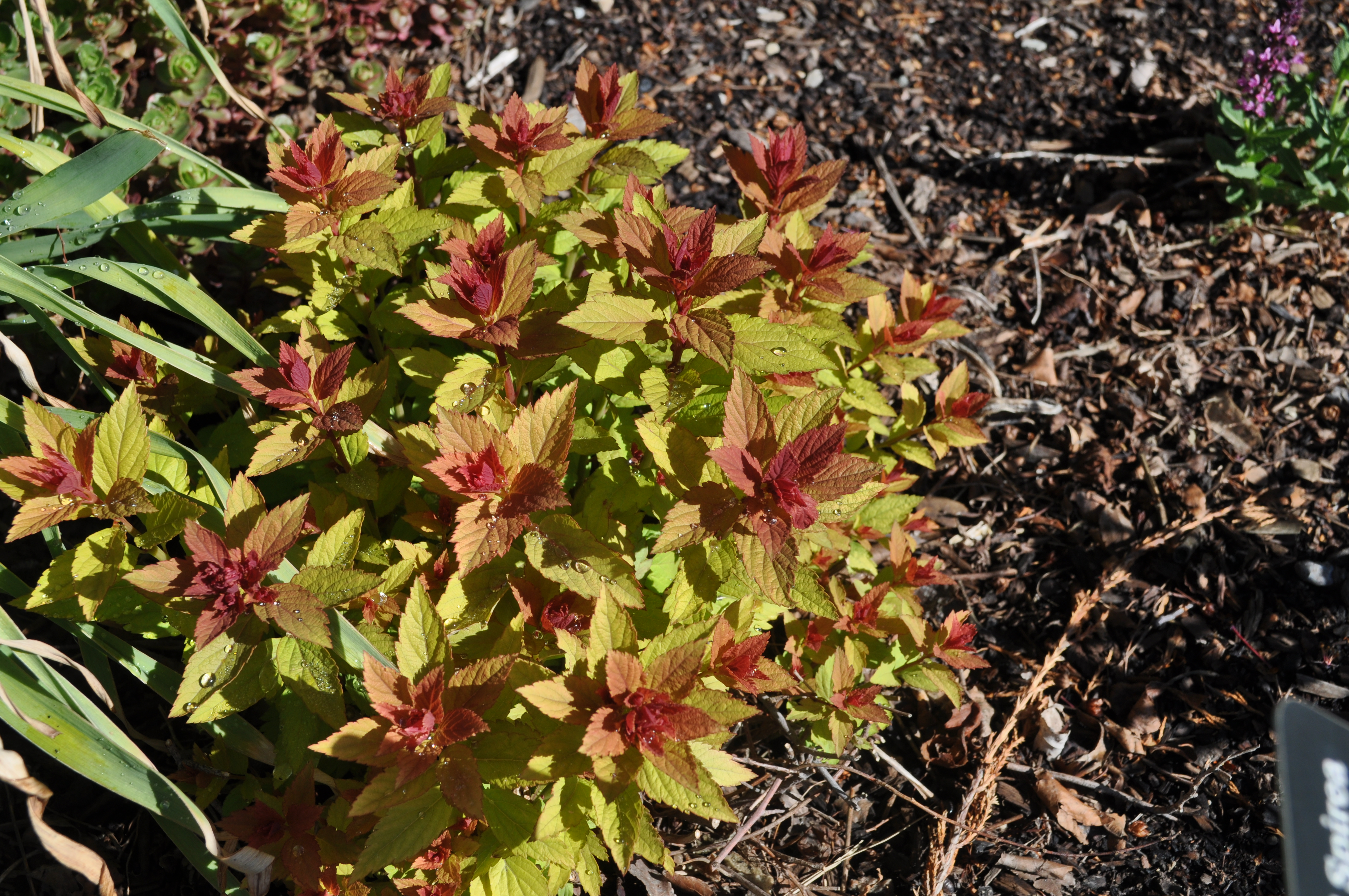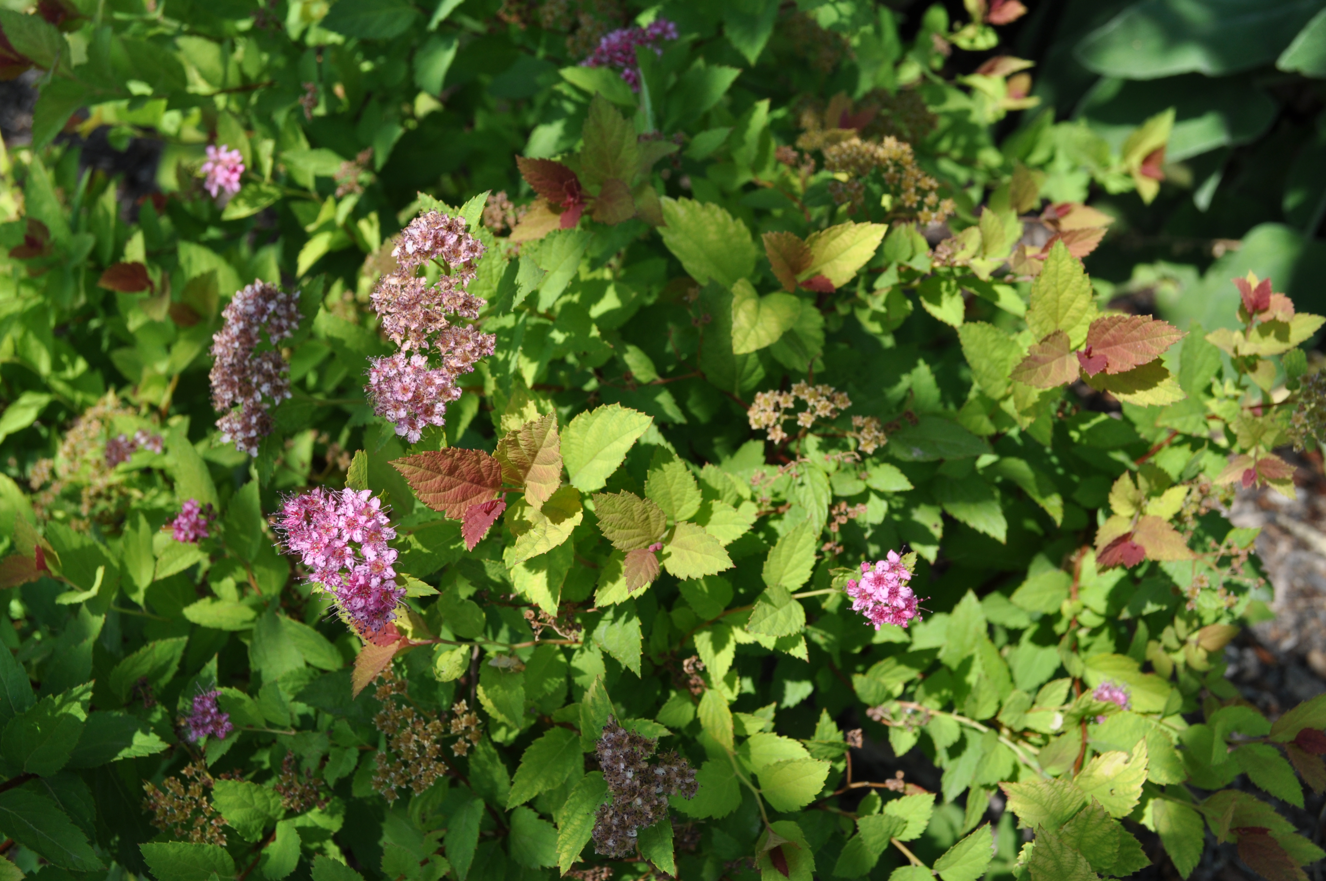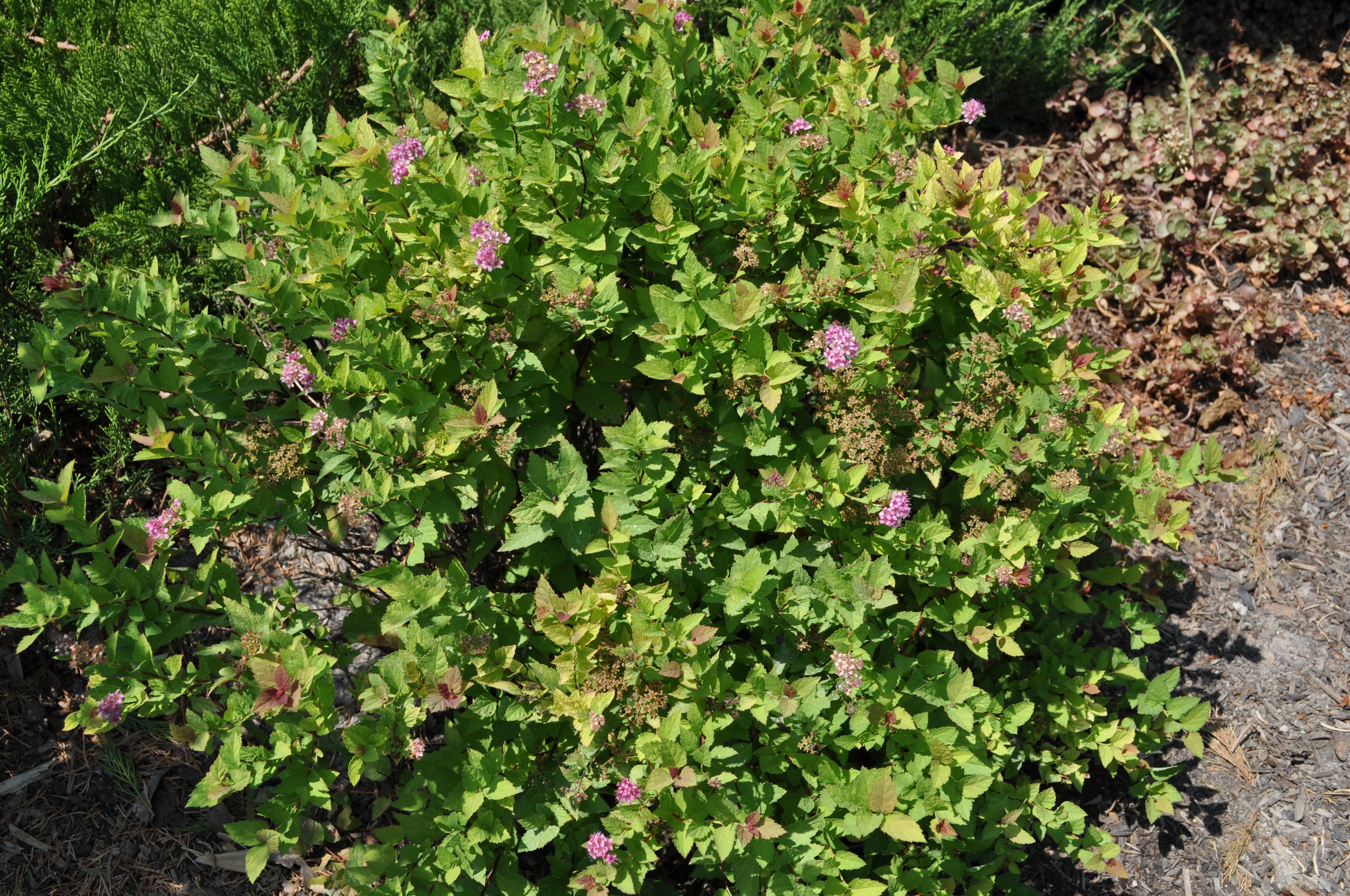 Plant Description: Small, rounded deciduous shrub. Produces abundant flat clusters or rose pink flowers in mid to late spring into the summer. Young leaves emerge reddish bronze. Depending on the amount of shade Walbuma is in, mature leaves will range from golden yellow to bright green. Requires significant pruning to promote more flowering.