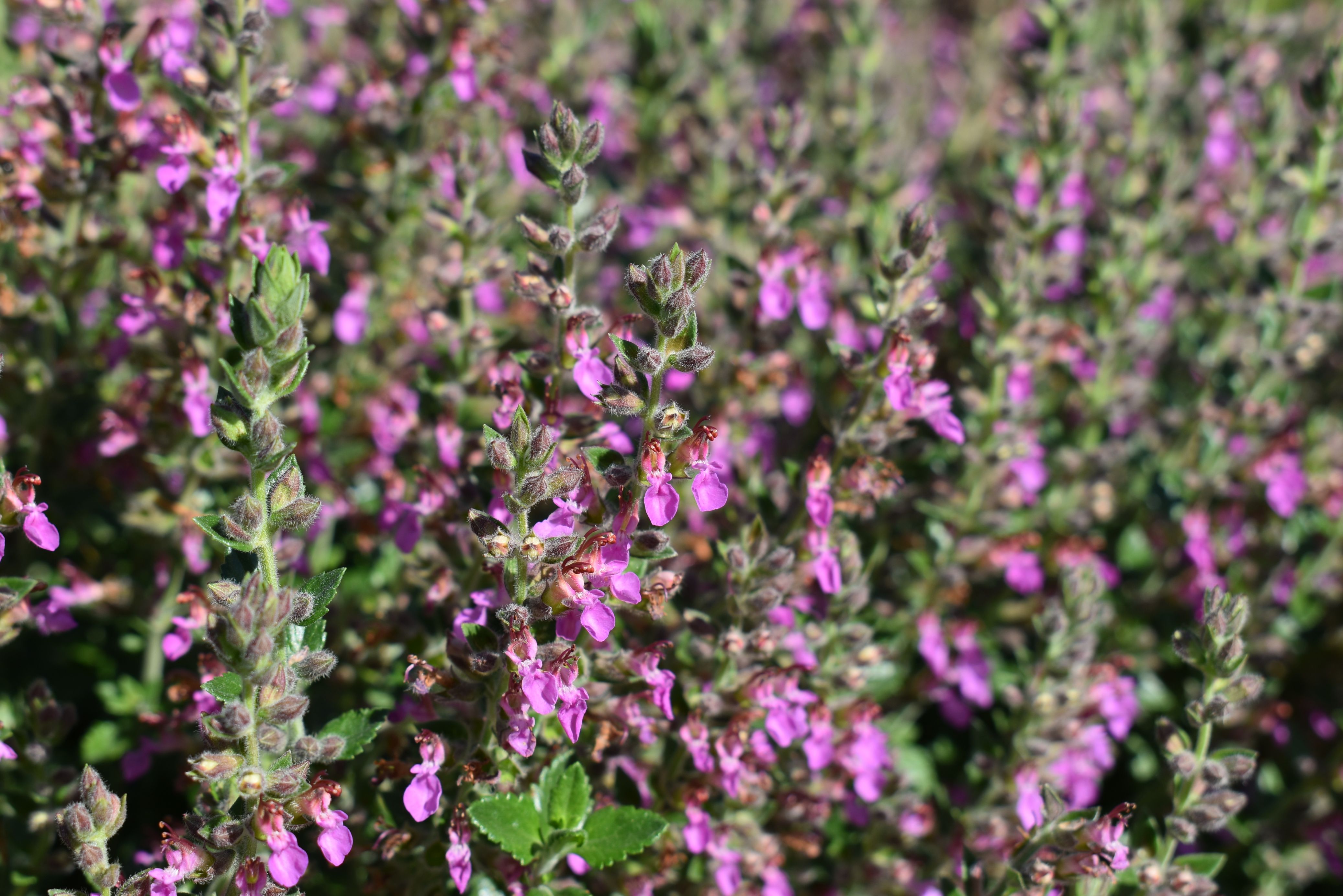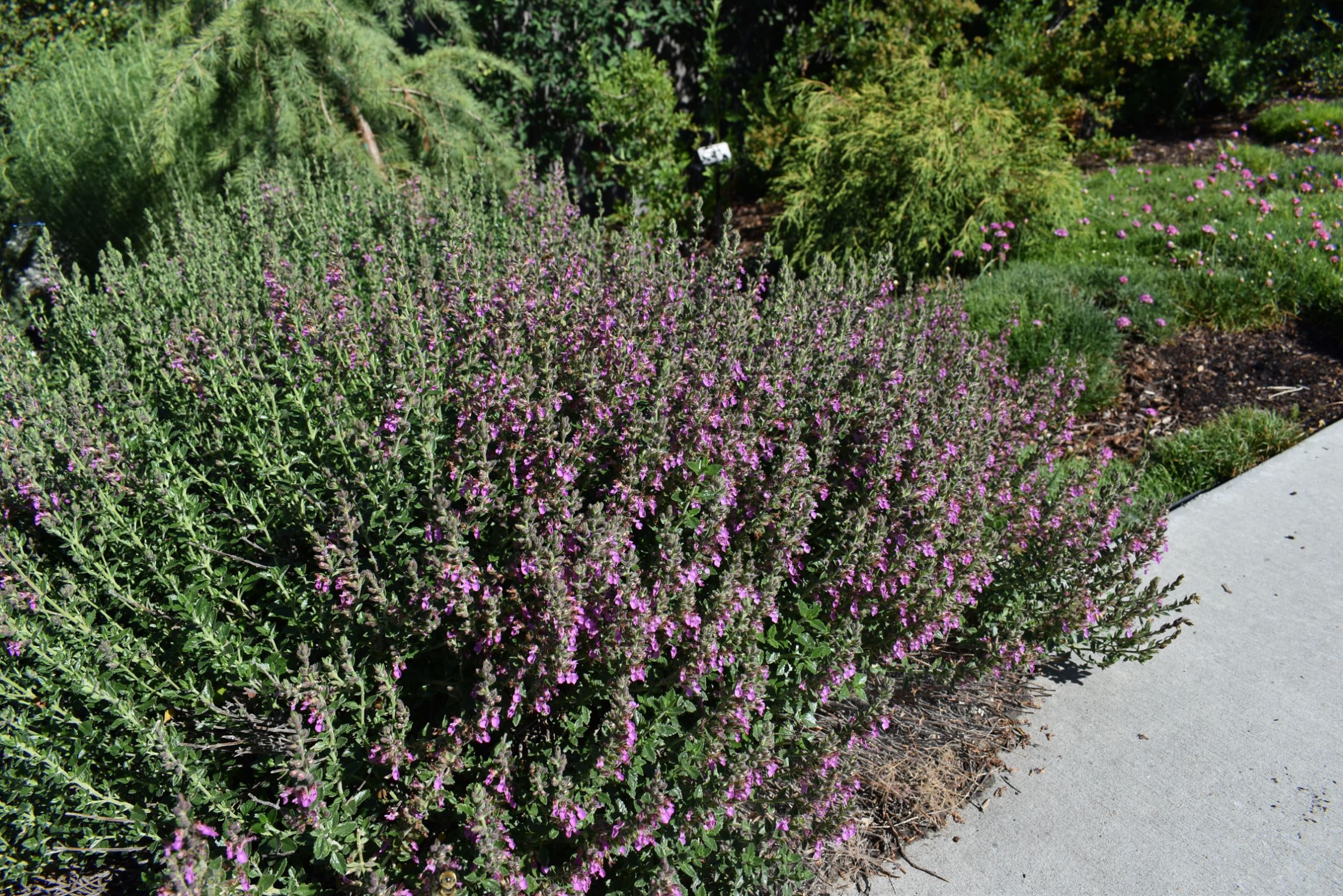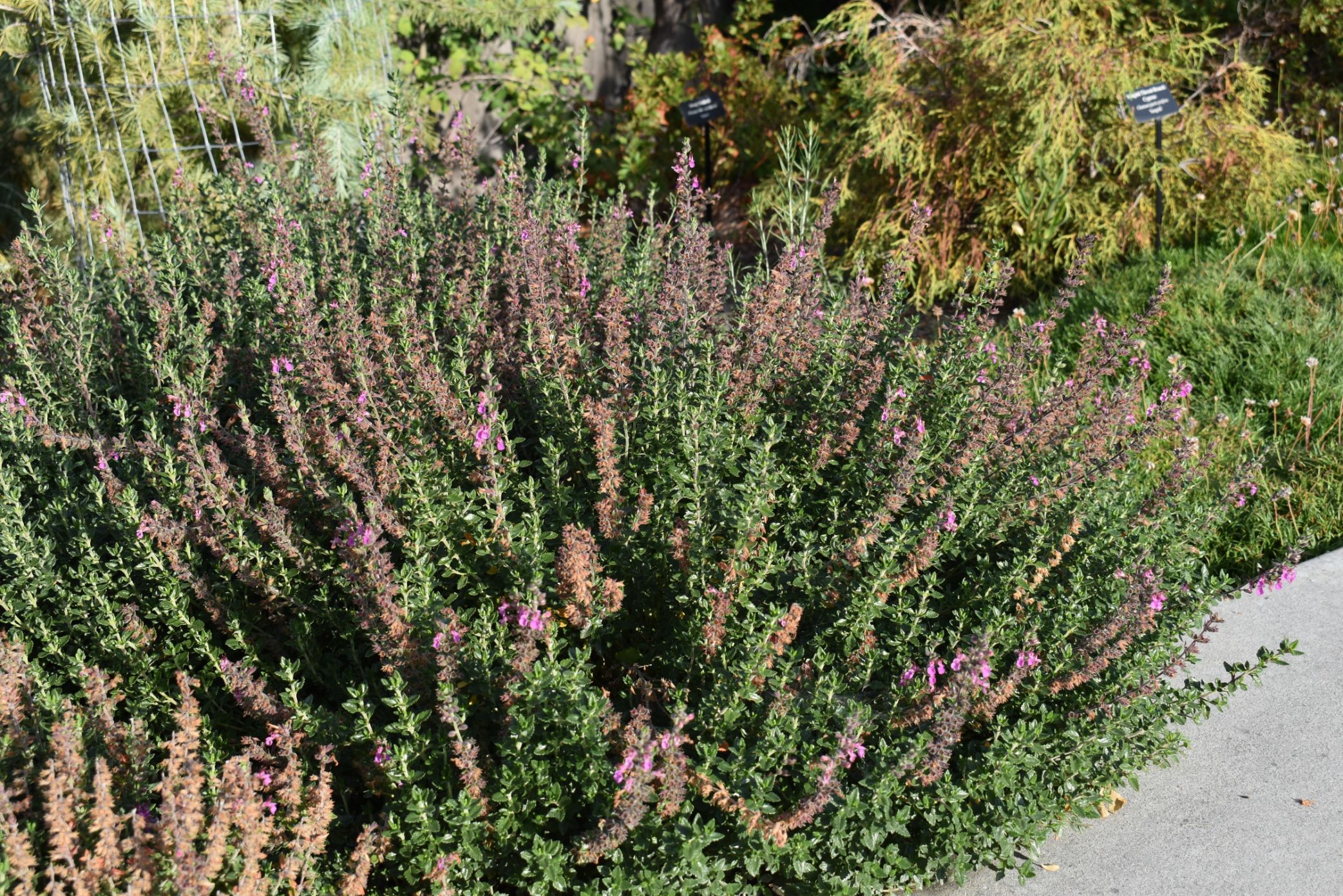Plant Description: A shrubby, semi-evergreen perennial with small dark green leaves, also known as Wall Germander. It bears pale pink to deep purple flowers in late summer. Small oak-like leaves are dark green and glossy on top and gray underneath. Cut to within an inch of ground level in spring, to maintain a compact habit. Prefers full sun.