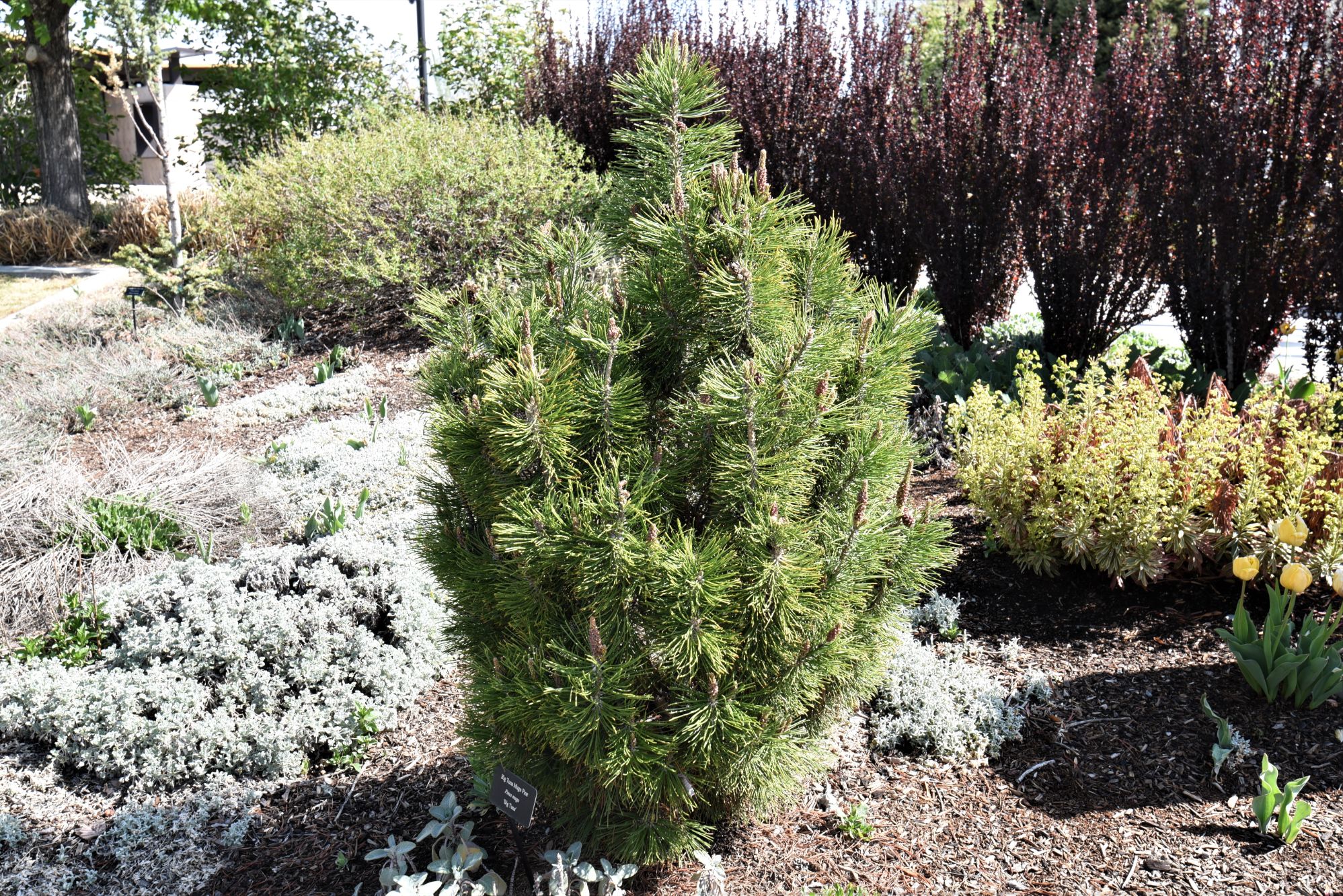 Plant Description: Medium to large rounded to spreading evergreen shrub. Spreading branches are scaly and gray. Dark green needles are born in pairs up to three inches long. Bears dark brown female cones. May require some pruning to shape, simply prune the new growth or "candles." Tolerant of drought and many soil types.