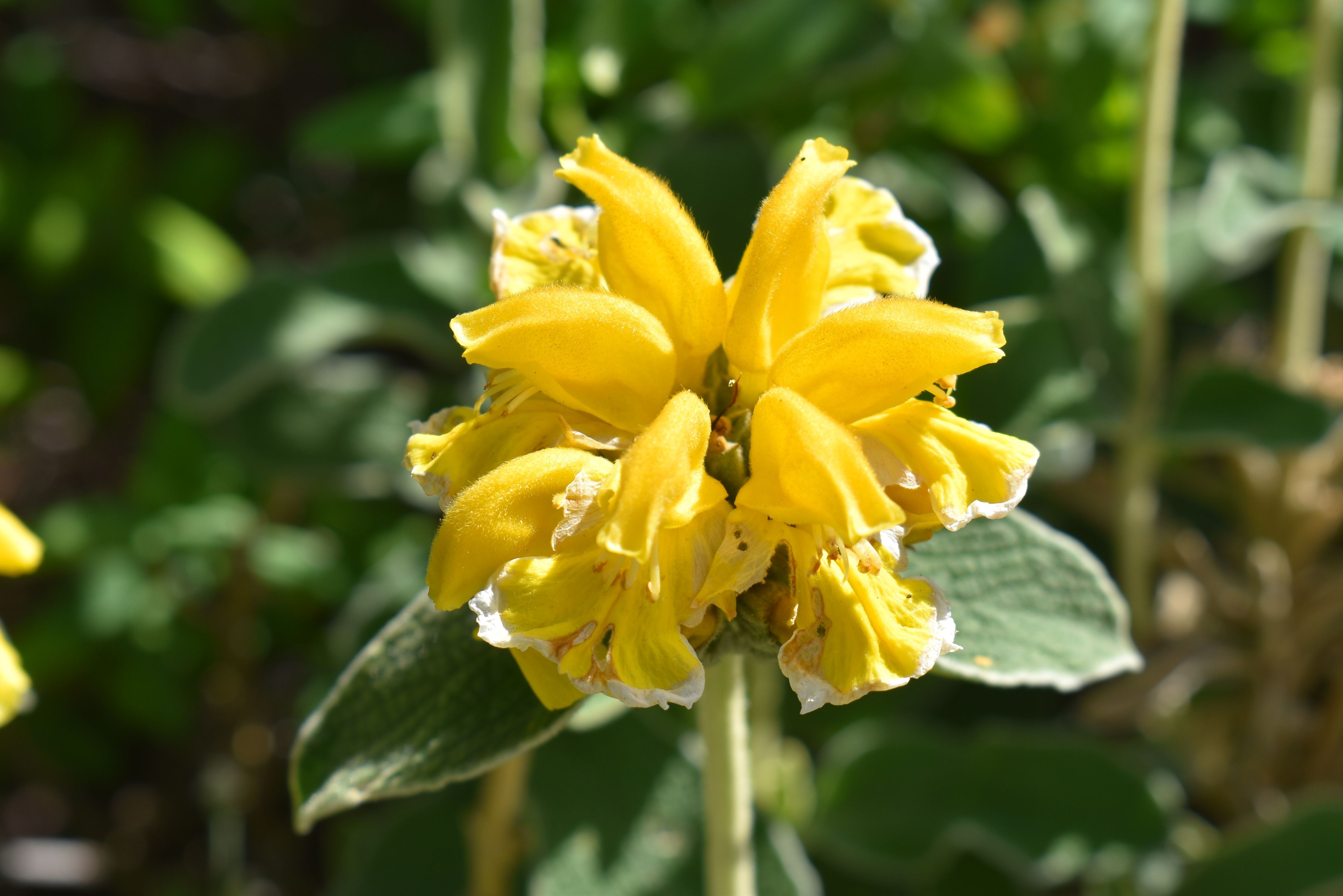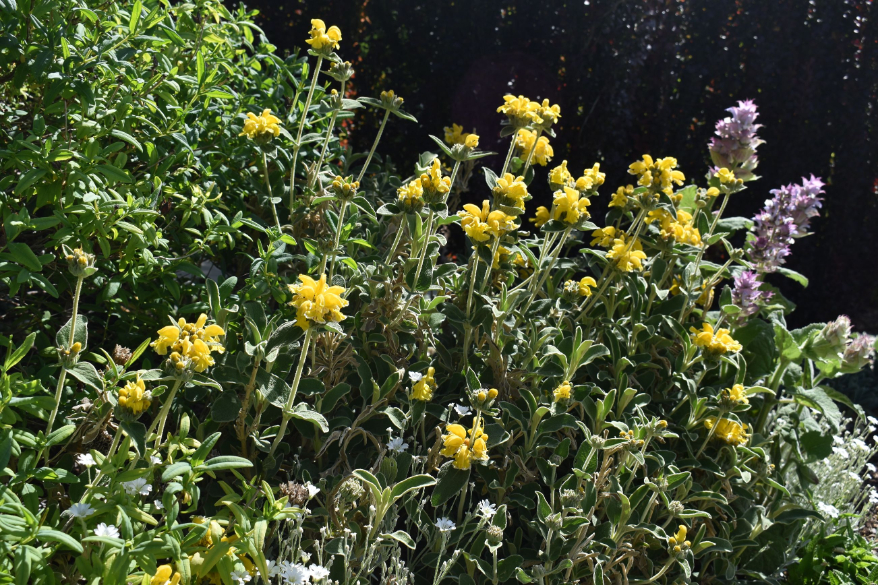 Plant Description: A shrubby perennial covered in sage-like gray-green leaves with woolly undersides. This is a hybrid of P. fruticosa x P. russeliana. Bears golden-yellow flowers in whorls during the summer months. Maintain the mounding form by cutting back to half its size in the fall. Prefers coastal areas and more temperate climates. May require some shelter in this area.