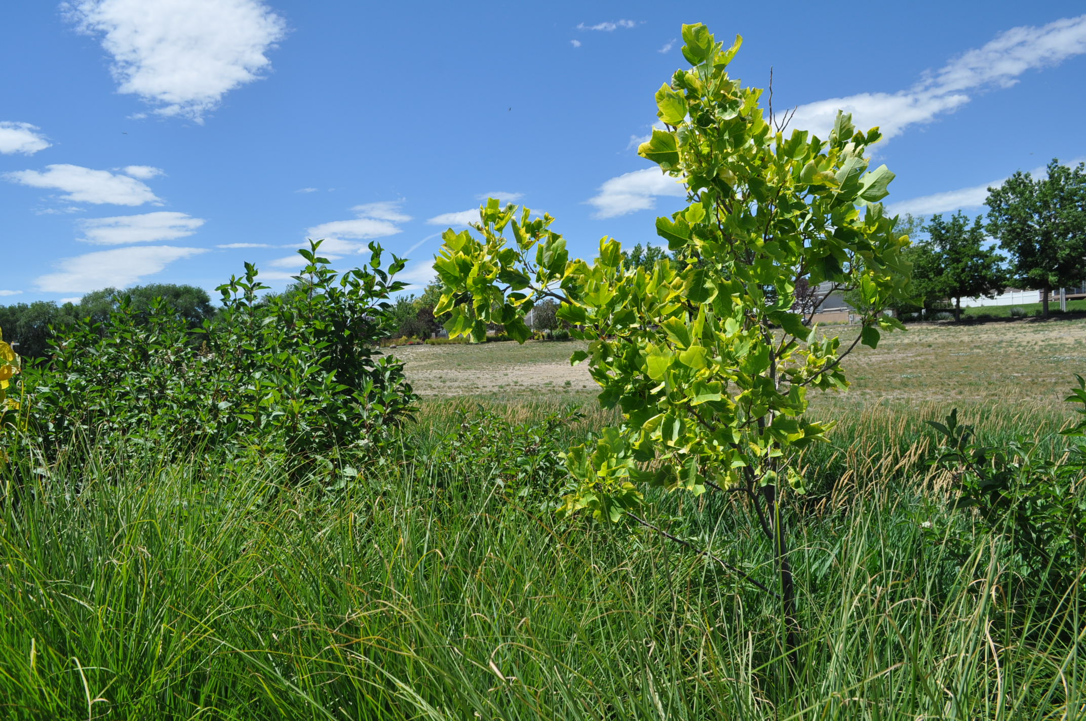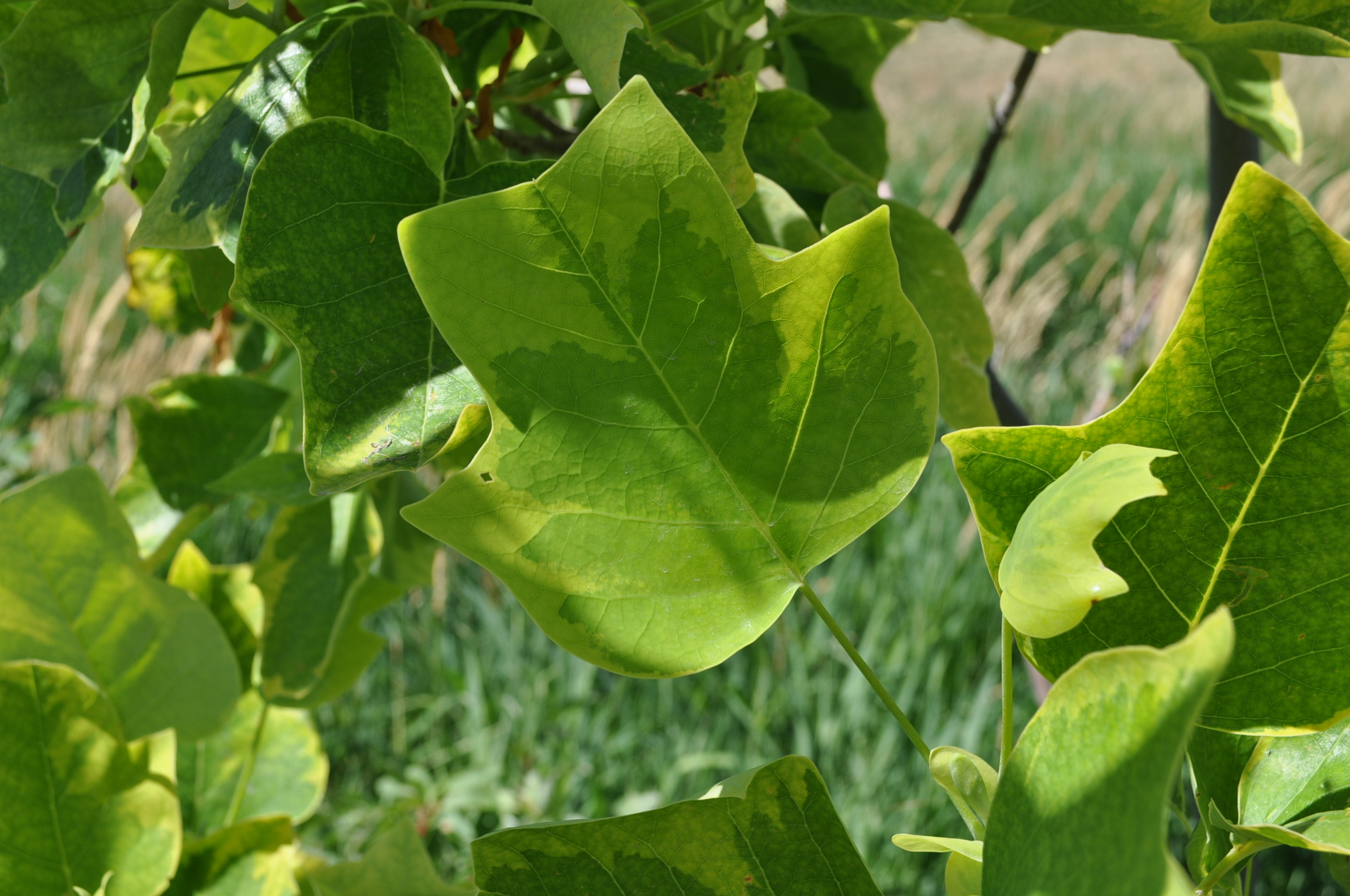 Plant Description: Golden edged lobed leaves adorn this large deciduous tree. Spring brings tulip shaped orange flowers. It prefers adequate water and acidic soils but may adapt to drier soils once established.