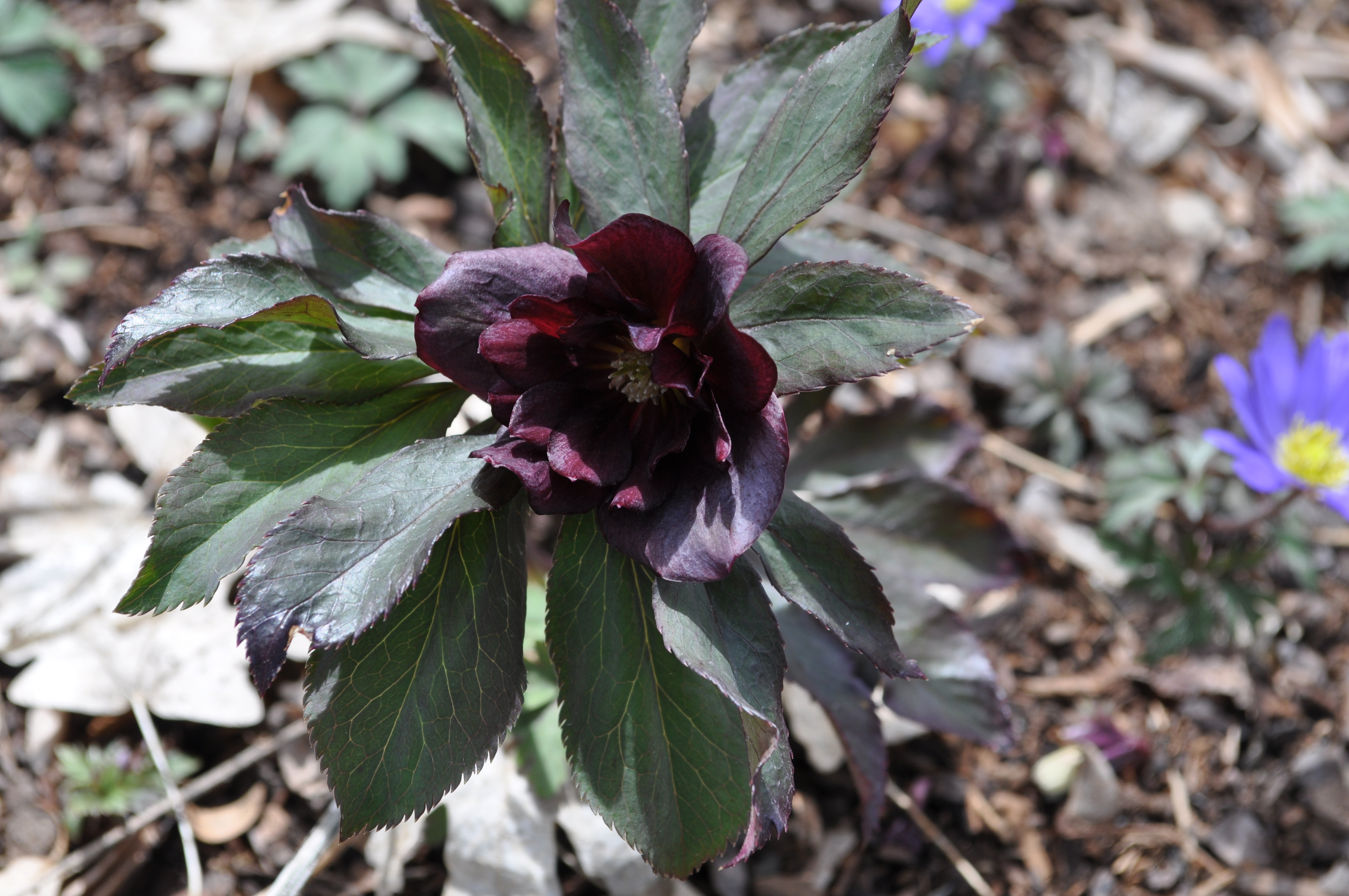 Plant Description: Dark and Handsome is a true description of these nearly black blossoms with lime-green centers. This early spring bloomer will catch the eye of all visitors. This is a double flowering variety with dark evergreen foliage. It thrives in full to part shade and will be enjoyed for many years to come.