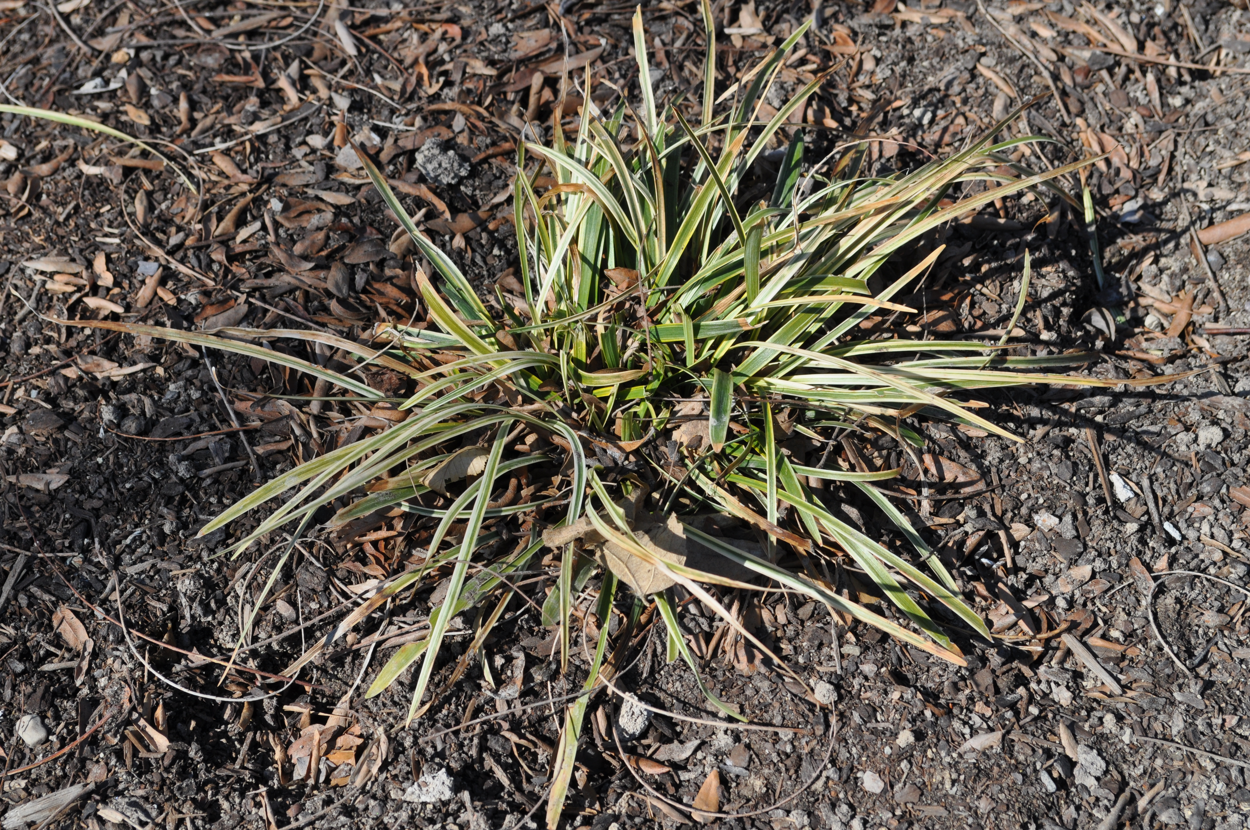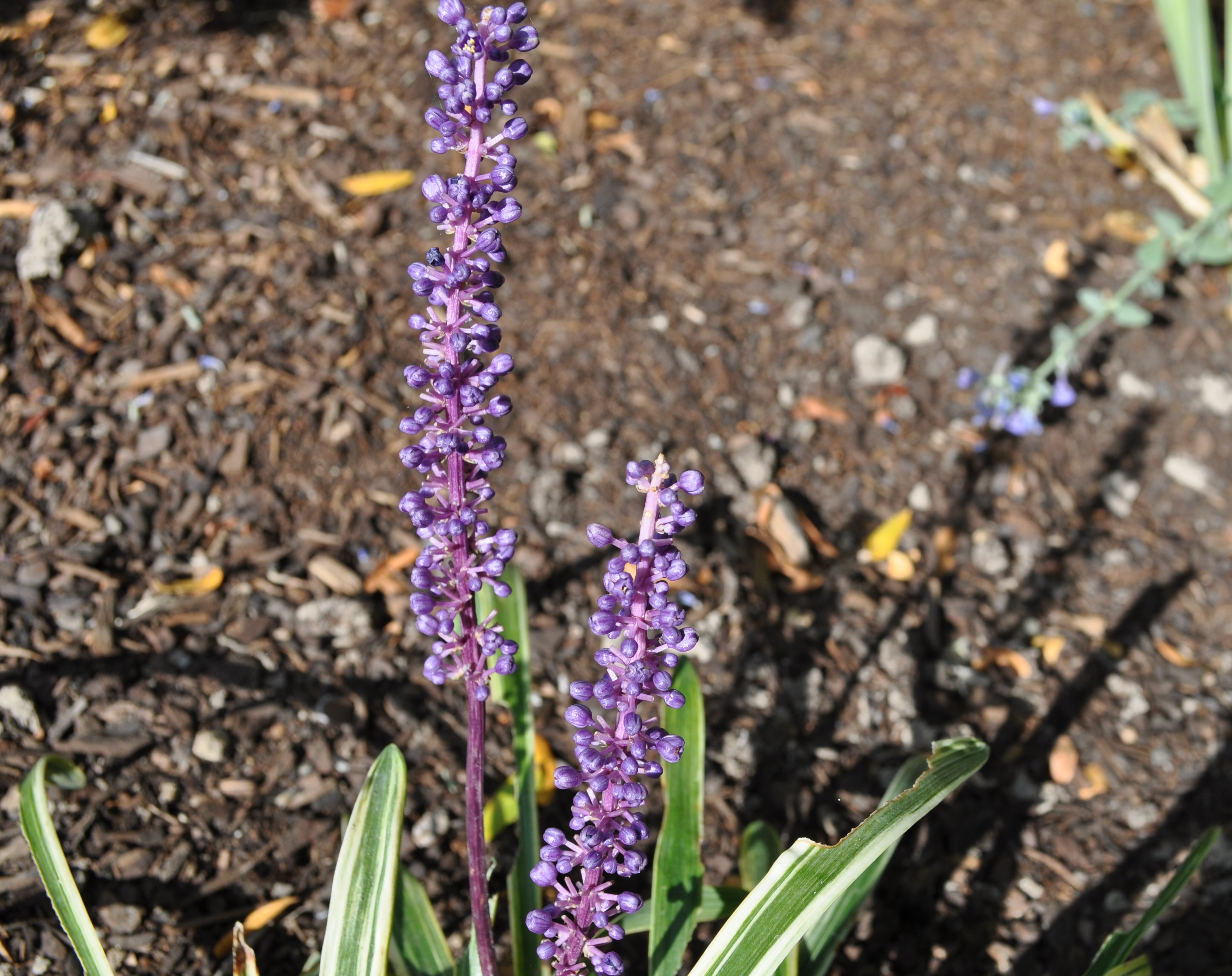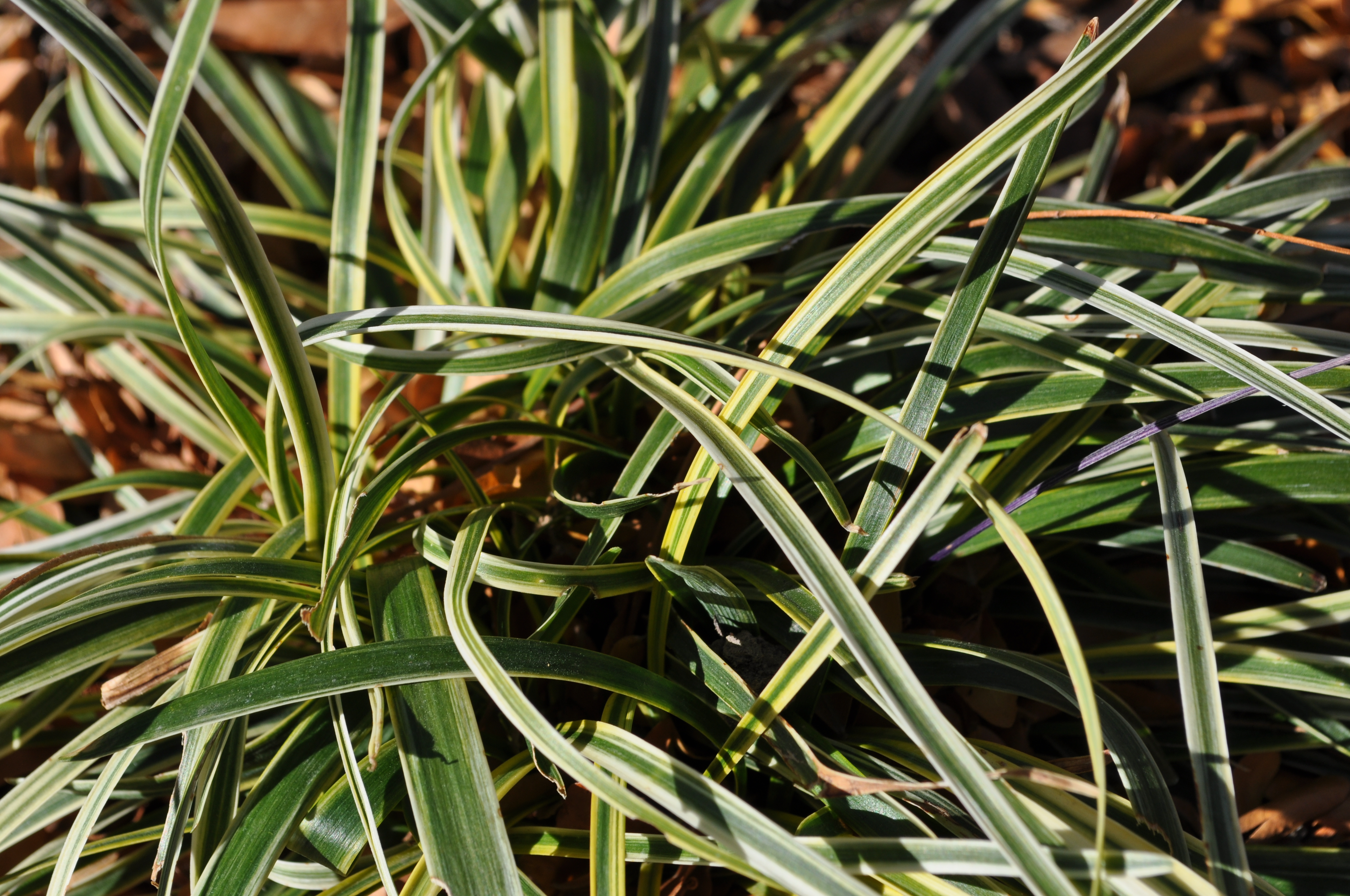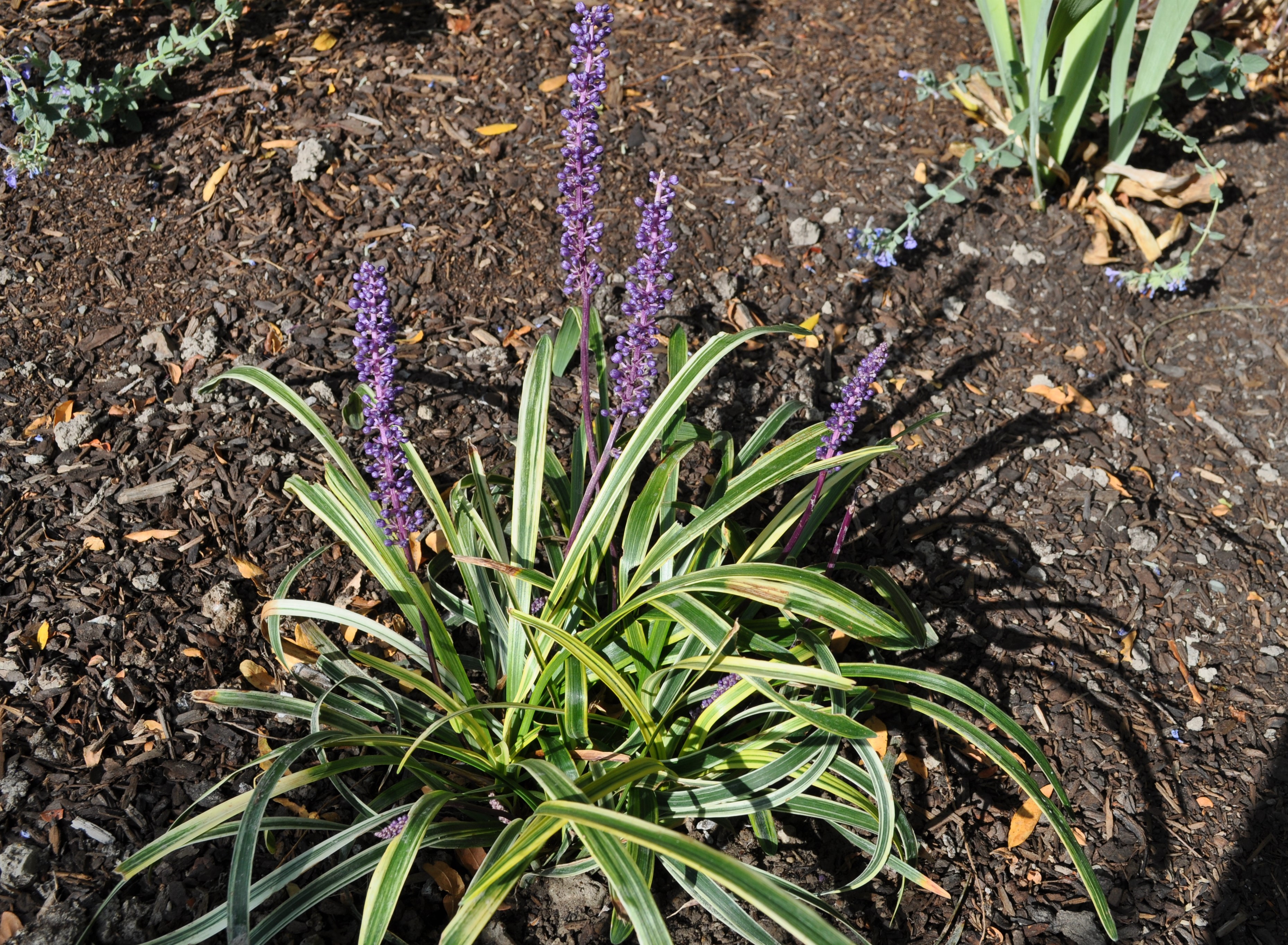 Plant Description: Long, arching leaf blades of green with creamy white edges will add interest to the landscape. On top of the showy evergreen foliage, spikes of lilac purple blossoms contrast beautifully from early to midsummer.