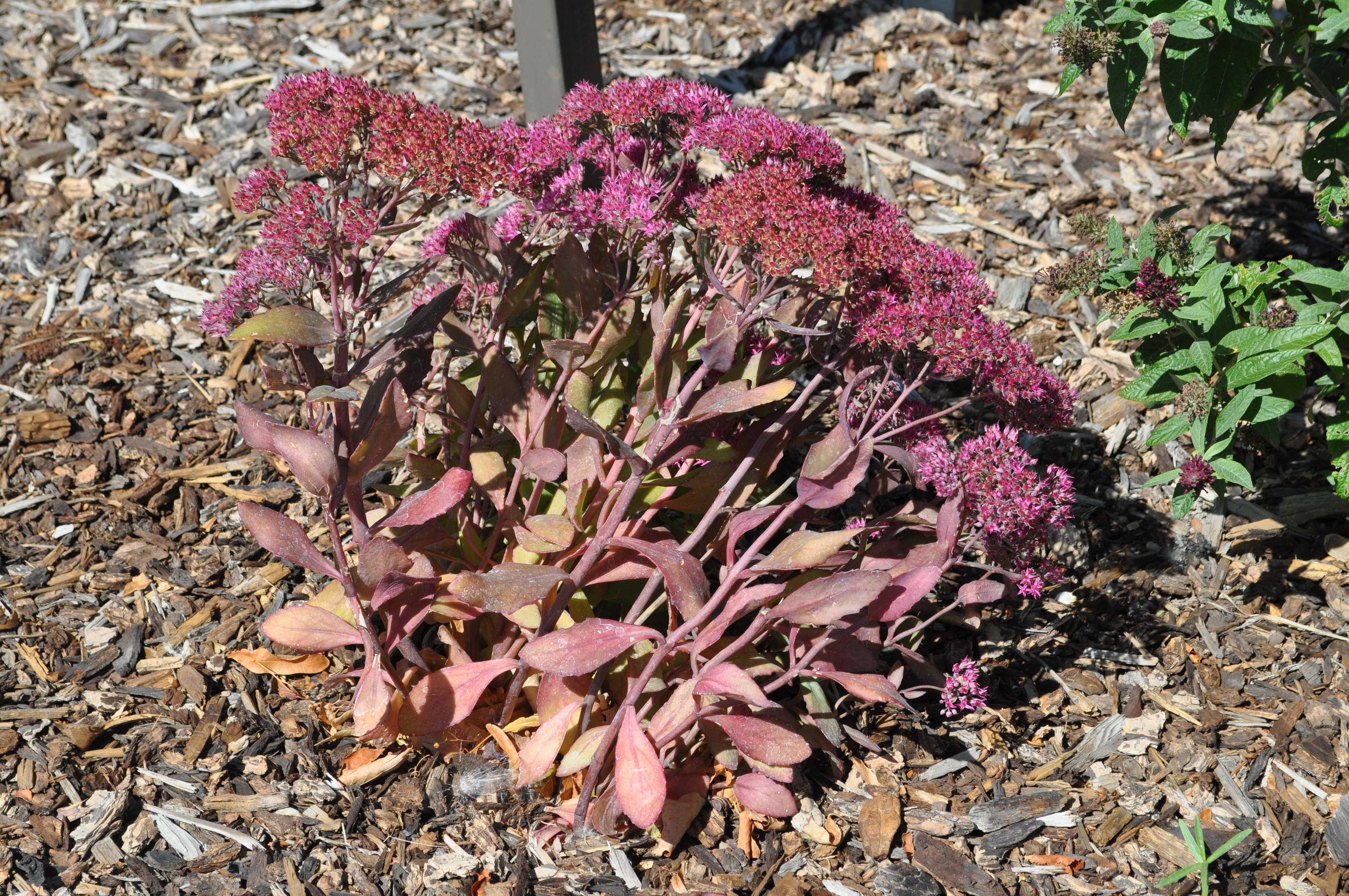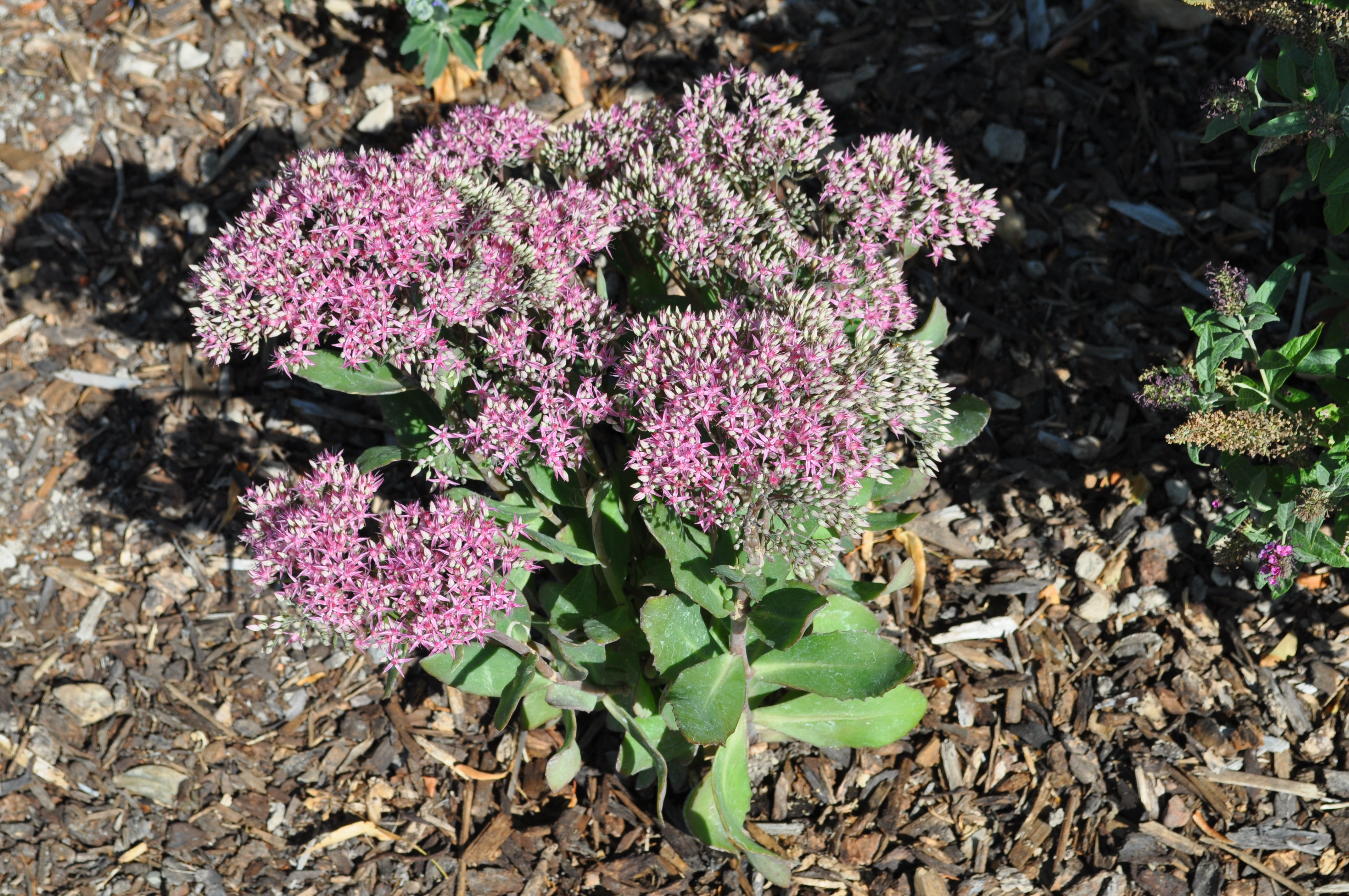 Plant Description: This Stonecrop is upright and clumping in habit. The foliage is green with a slight tint of silver-blue that contrasts beautifully with the magenta blossoms. The late summer into early fall brings dense heads of light purple buds that blossom into vivid hot-pink flowers. The leaves turn a soft red as the temperatures become cooler.
