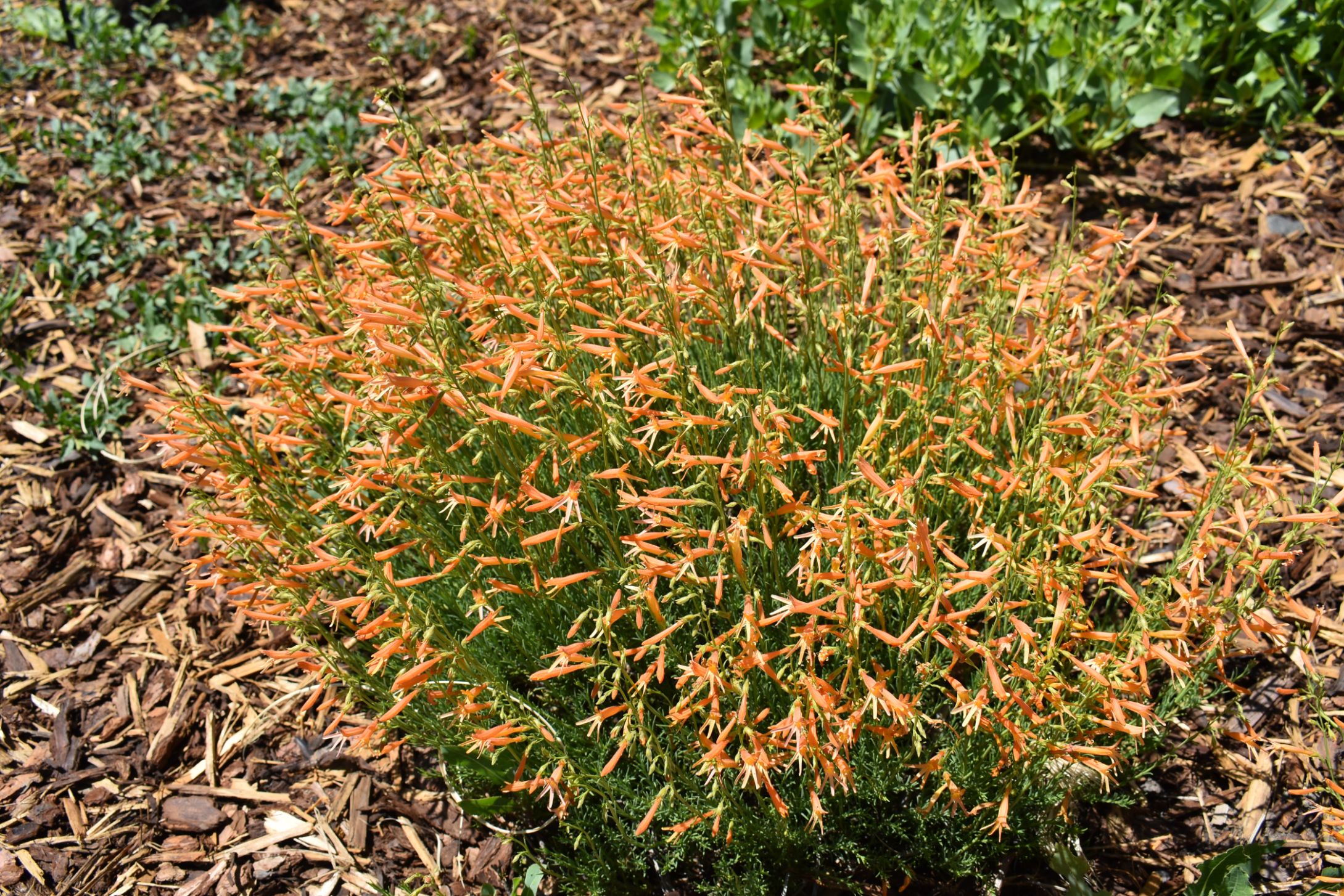 Plant Description: This Penstemon has a natural mounding form and glossy green leaves that resemble pine needles. The warm orange blossoms bloom throughout the summer. This perennial will beautifully compliment plants that have shades of blue, pink and silver. Native to New Mexico.