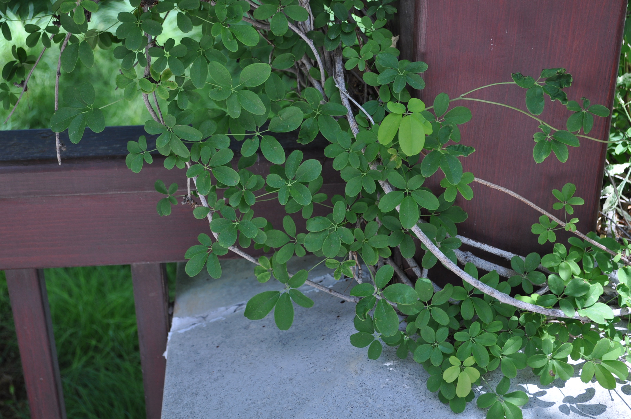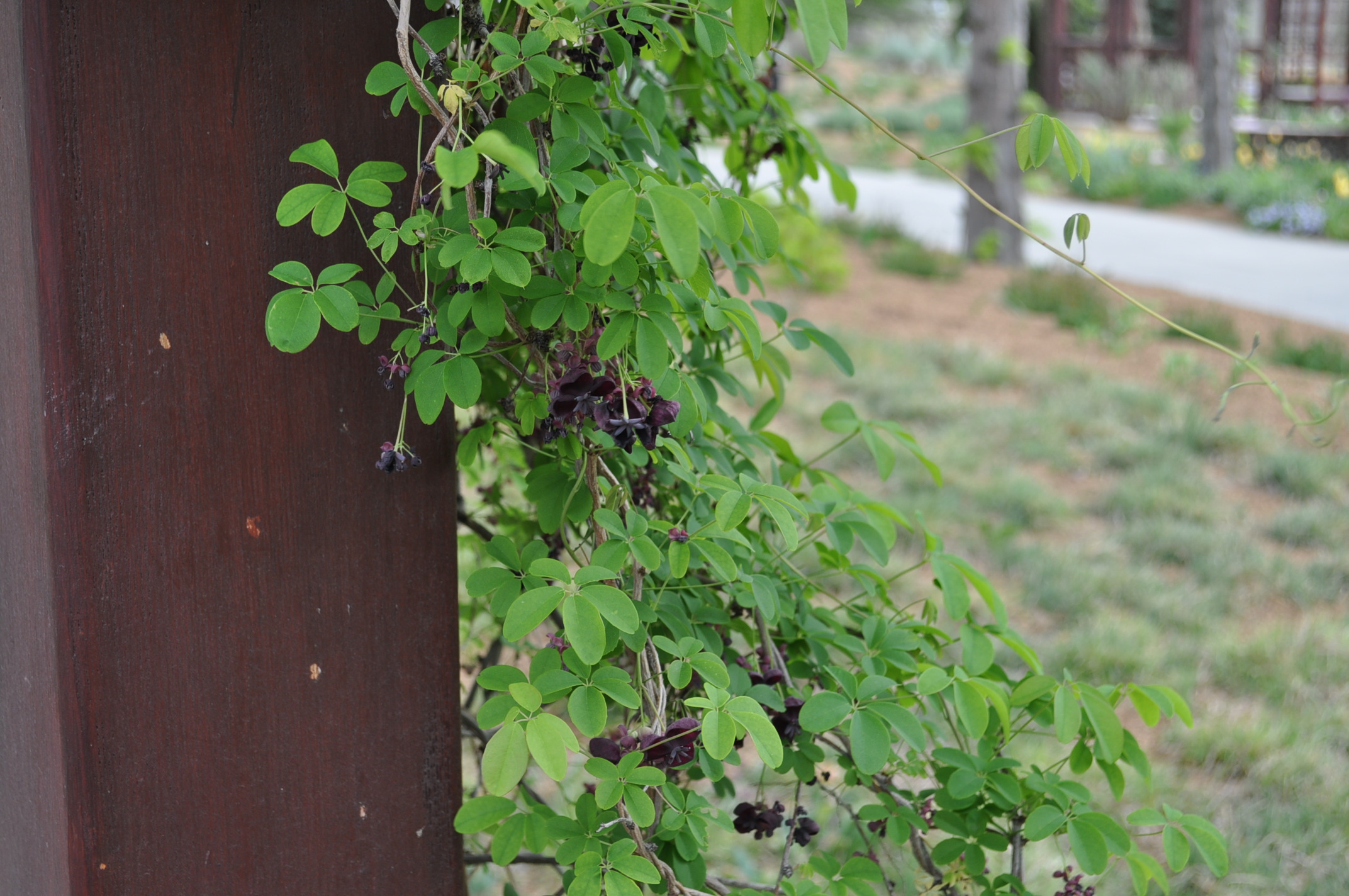 Plant Description: The chocolate vine, also called five-leaf akebia, is a fast-growing deciduous vine. Each leaf is palmate and composed of five oblong leaflets that are bluish-green in maturity. Drooping racemes of small chocolate to purple flowers bloom in early-spring. If grown in close proximity to others of its kind, it will produce pods filled with seeds and a whitish-pulp that is edible. Grows well in a variety of soils and will tolerate some drought. The chocolate vine is an aggressive grower and will need to be cut back to keep it from strangling nearby plants. It will tolerate being sheared to the ground each spring.