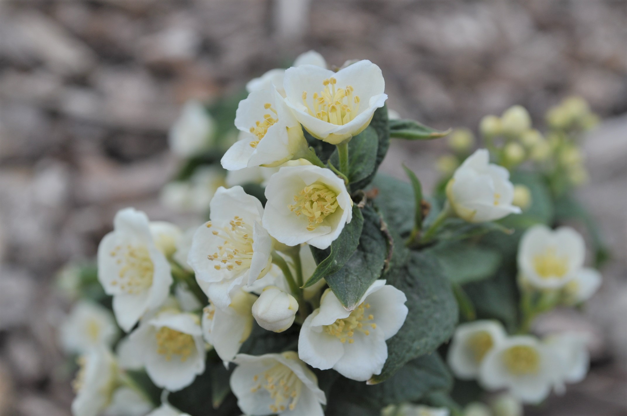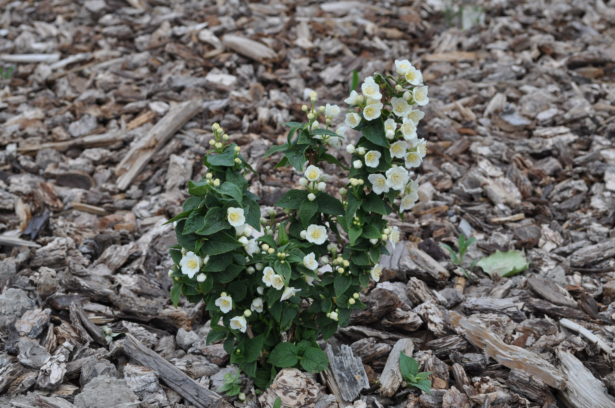 Plant Description:   This shrub has a more petite and narrow shape compared to other Mockoranges, making it great for the landscape. The hardy stems hold roughly textured, deep green leaves, which turn yellow in the fall. The arrangement of leaves makes the stems resemble a four-sided tower.  In late spring to early summer, highly fragrant white flowers blossom in-between the foliage.