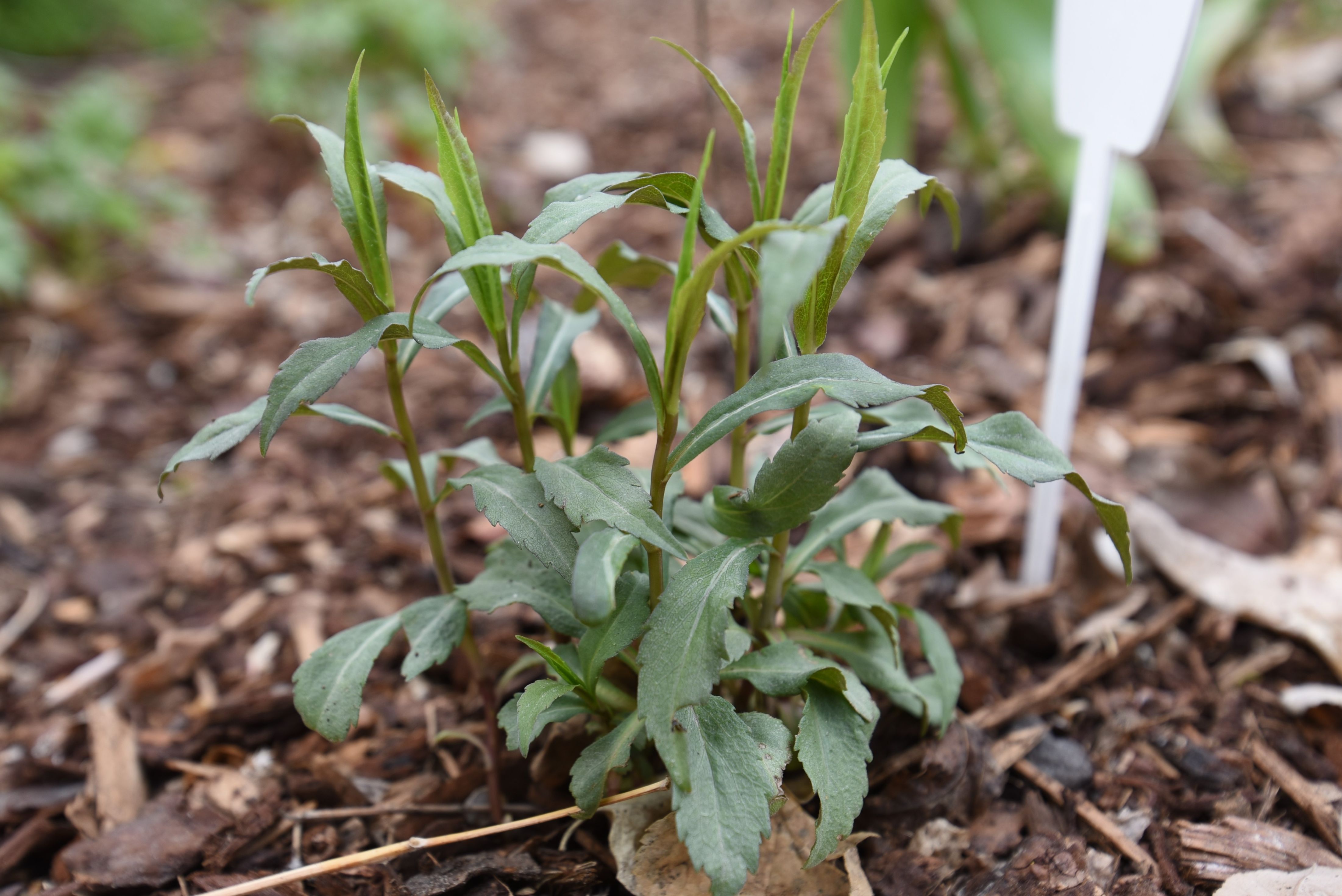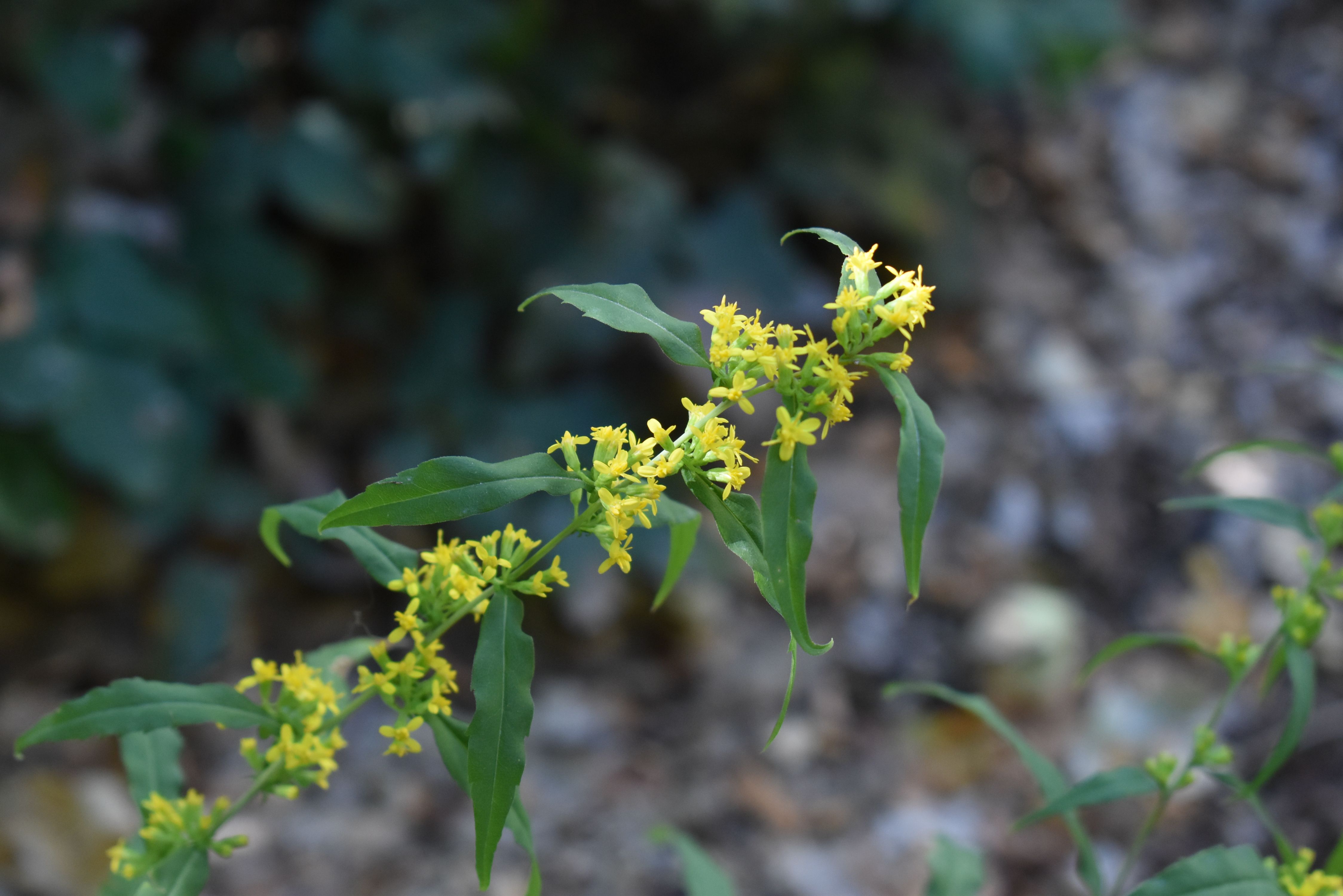 Plant Description: Pointed green leaves droop below clusters of small yellow flowers that run the length of long arching purple stems. Also known as Wreath Goldenrod, this lovely wildflower is native to eastern north America and has a unique form and texture that stands out in woodland and pollinator gardens.
