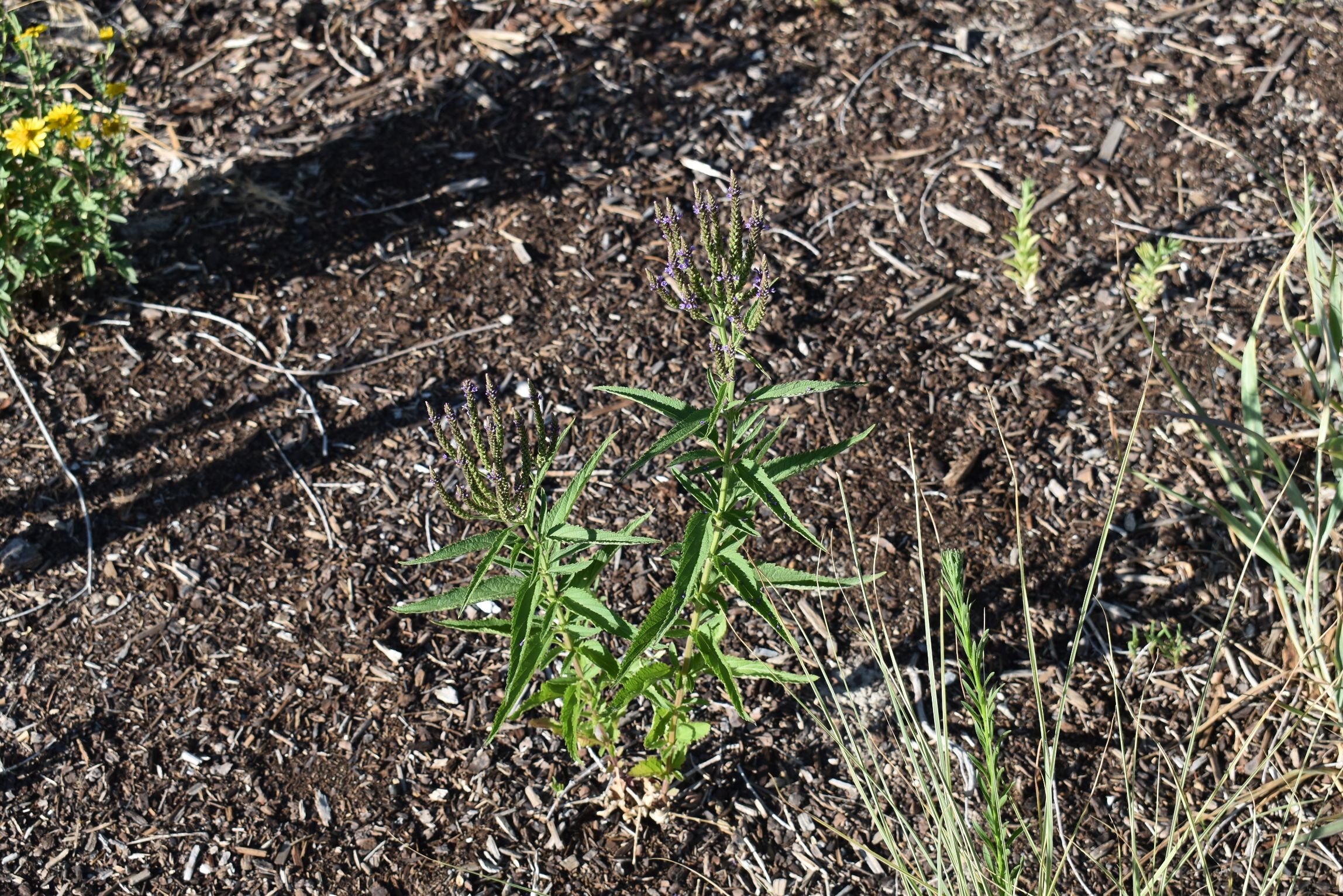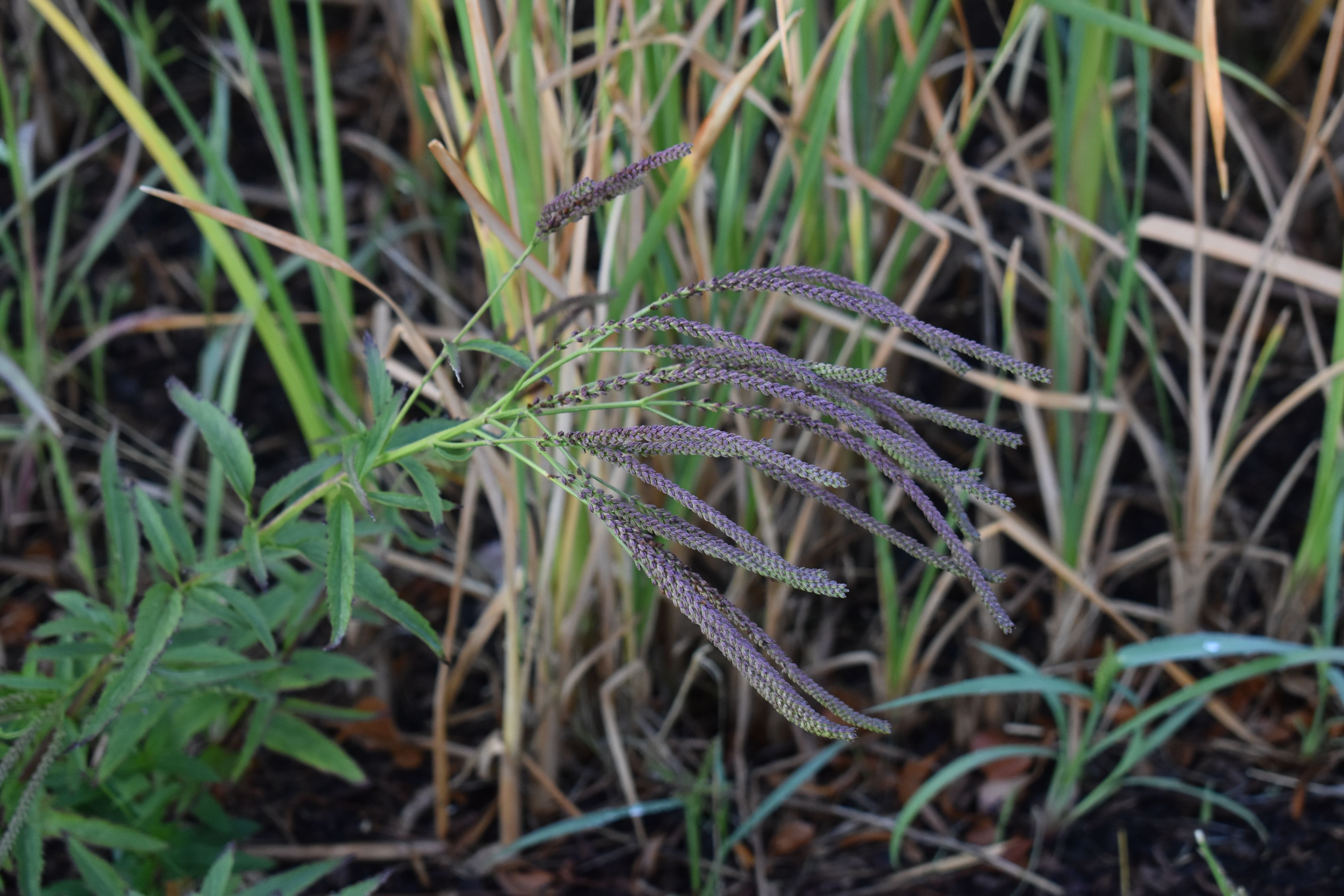 Plant Description: Rough, sharply toothed foliage grows in irregular clumps. Attractive flower spikes sit high above the foliage on hairy, extremely slender candelabra-like branching stems. The spikes are made of tiny, densely packed, purple-blue flowers and are enjoyed for most of summer and may even last into early fall. Blue Vervain prefers wet soil (although it can handle moderate dryness) making it perfect for rain gardens, bioswales and along waterways.