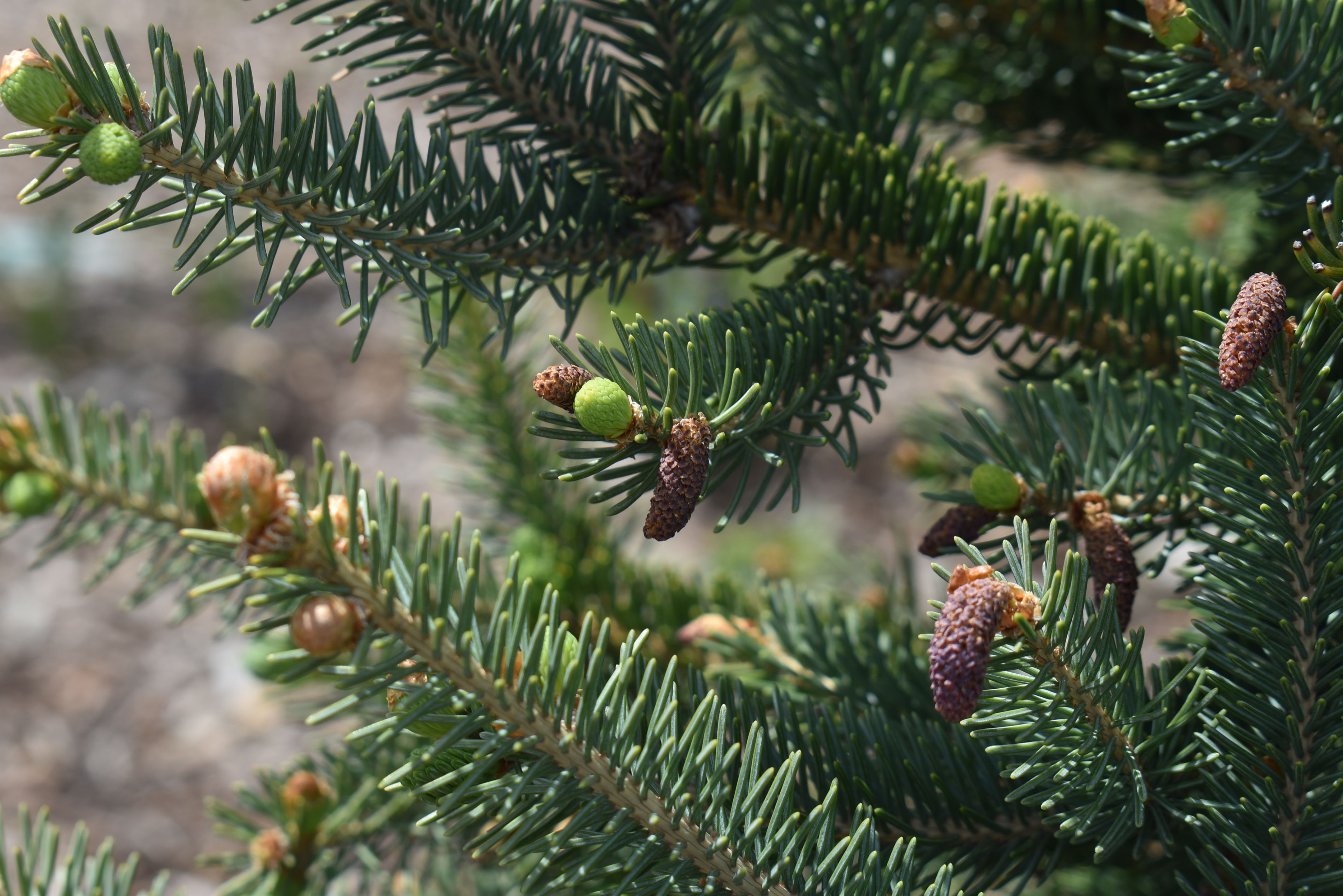 Plant Description: This tree is slow growing and has a pyramidal form with narrow, compact branches. The blue-green needles add great color to the garden. In the spring the pendulous, showy, red cones can be seen, adding another interest point. They work great when used as a windbreak or as a background tree.