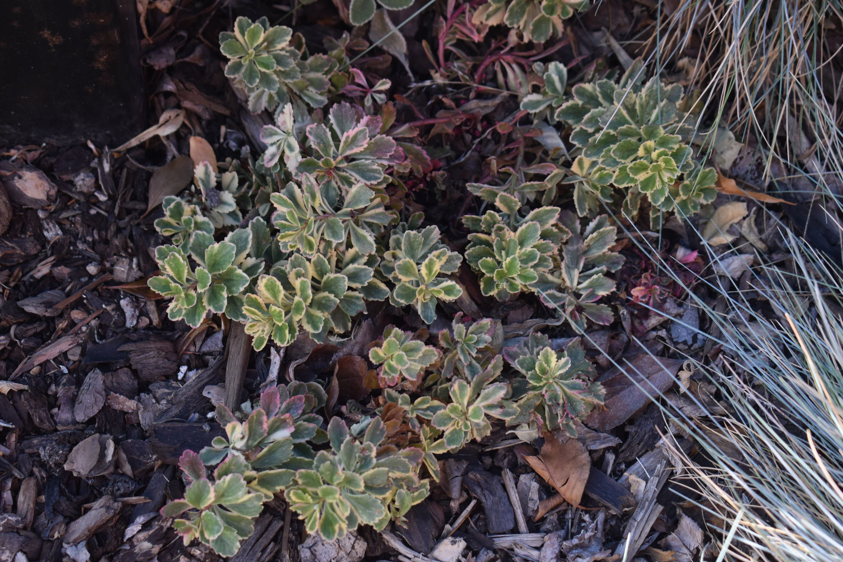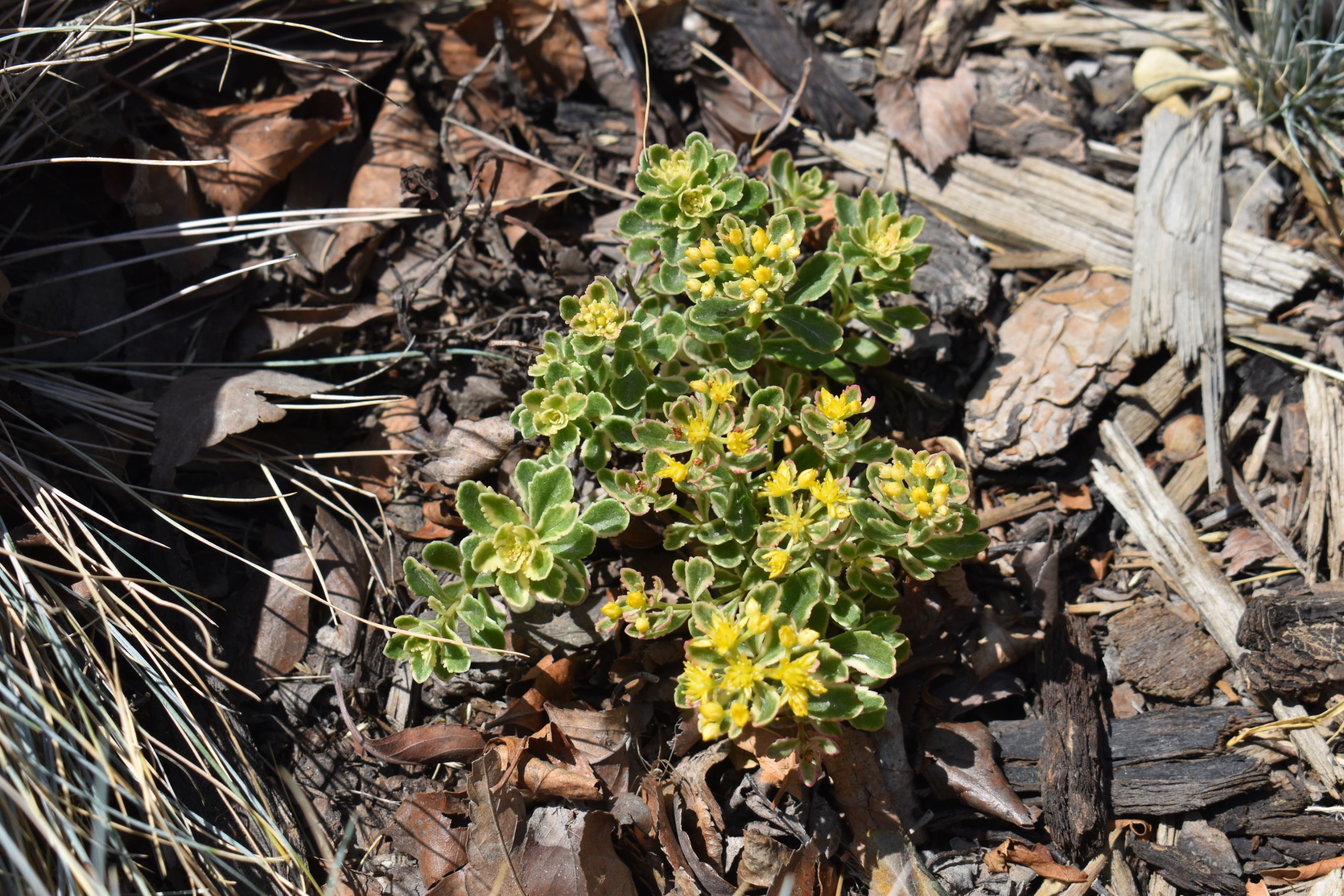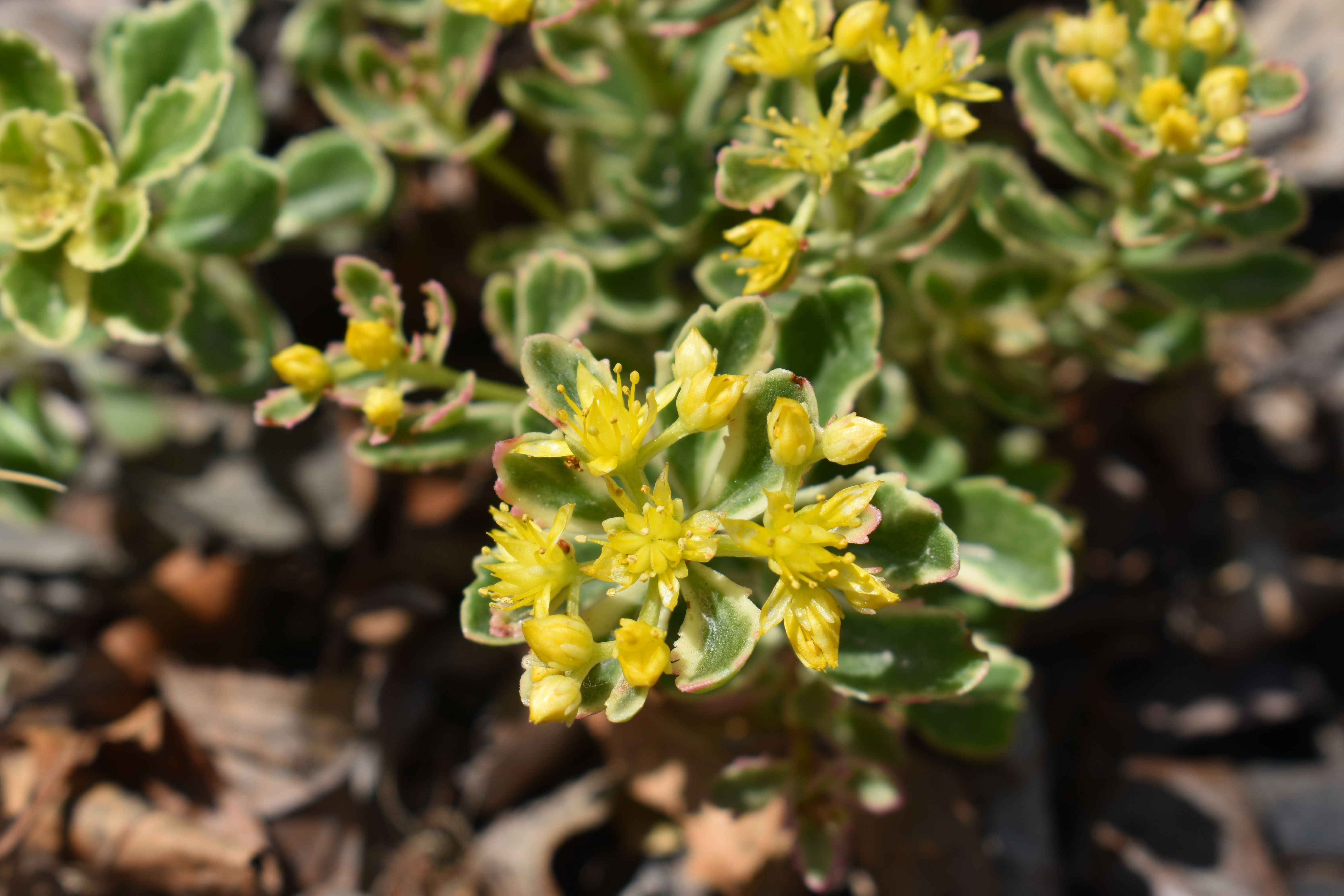 Plant Description: This succulent is a flashy groundcover sporting creamy white borders on dark green foliage. Bright yellow flowers are a great bonus in early summer. It has a compact growth habit that forms a solid mat of foliage. Loves full sun and is drought tolerant.