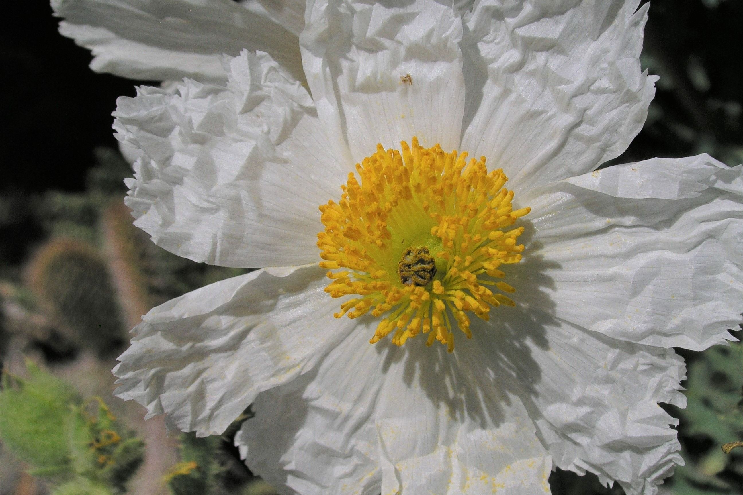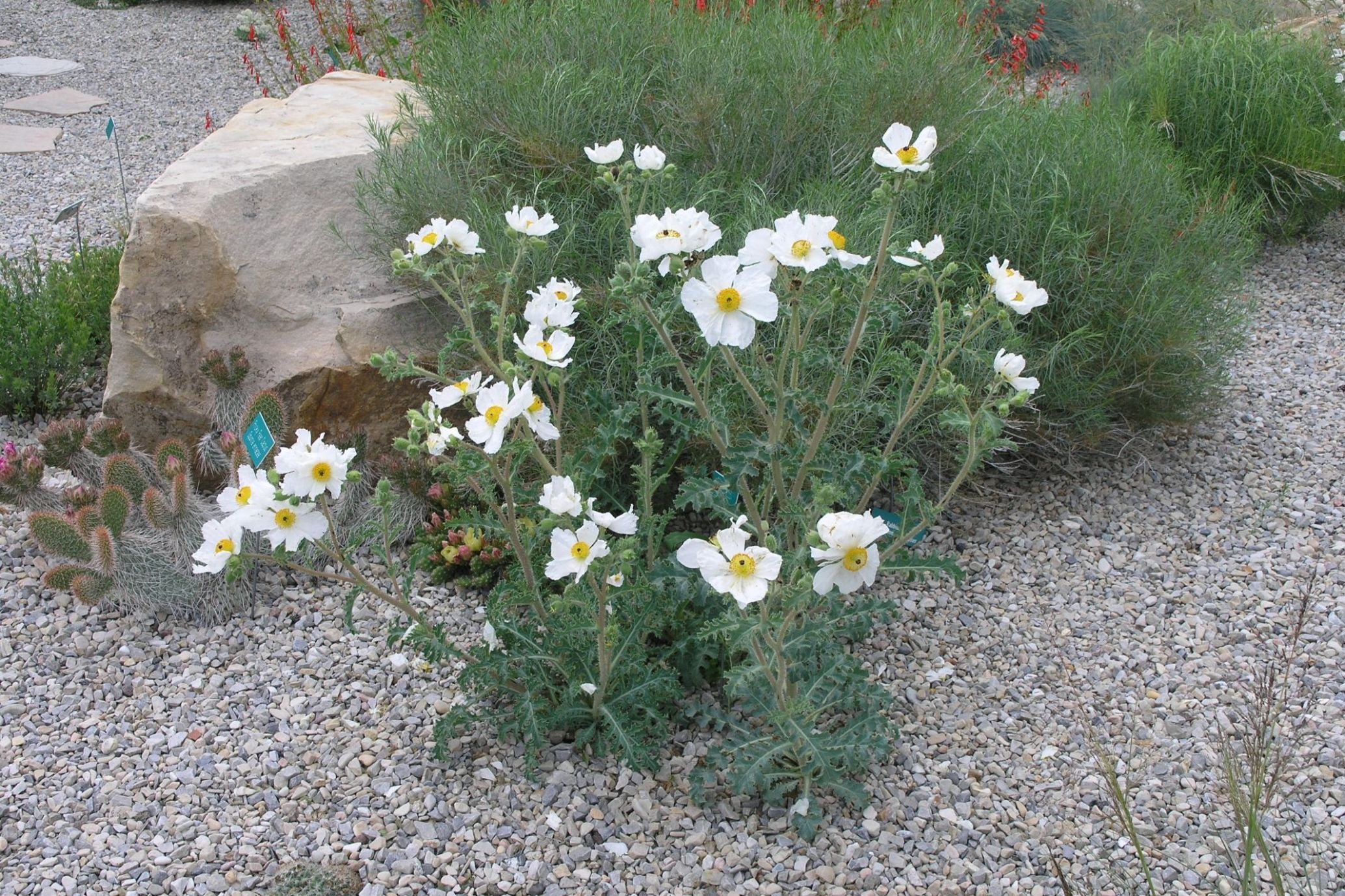 Plant Description:   Upright growing thorny perennial.  Blue-green lobed leaves grow basally and on upright red-tinted stems.  An otherwise undesirable plant is redeemed by the large white flowers with deep yellow centers.  Very drought tolerant.  Avoid planting in formal gardens.  Great choice for rock gardens.  May be somewhat invasive.