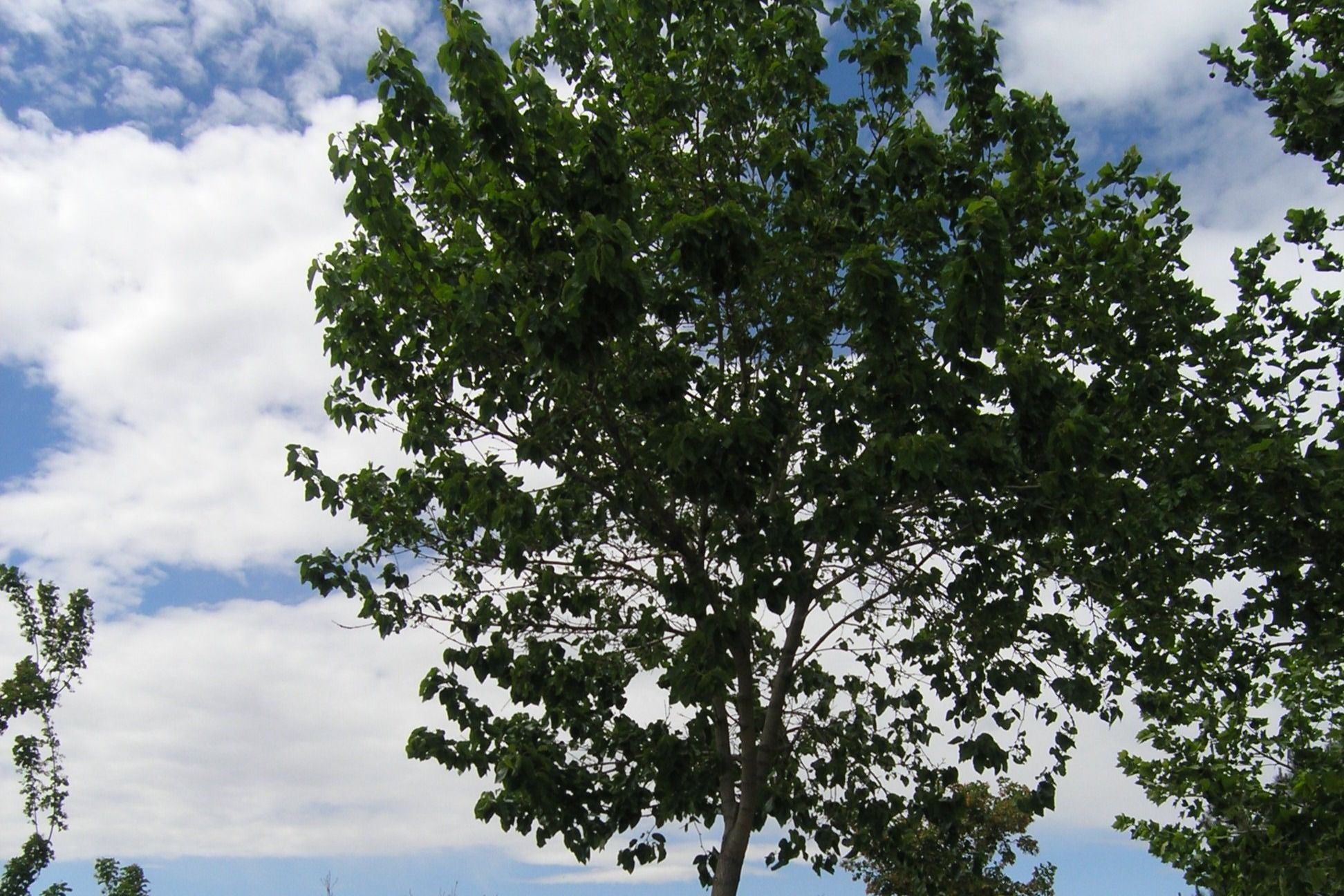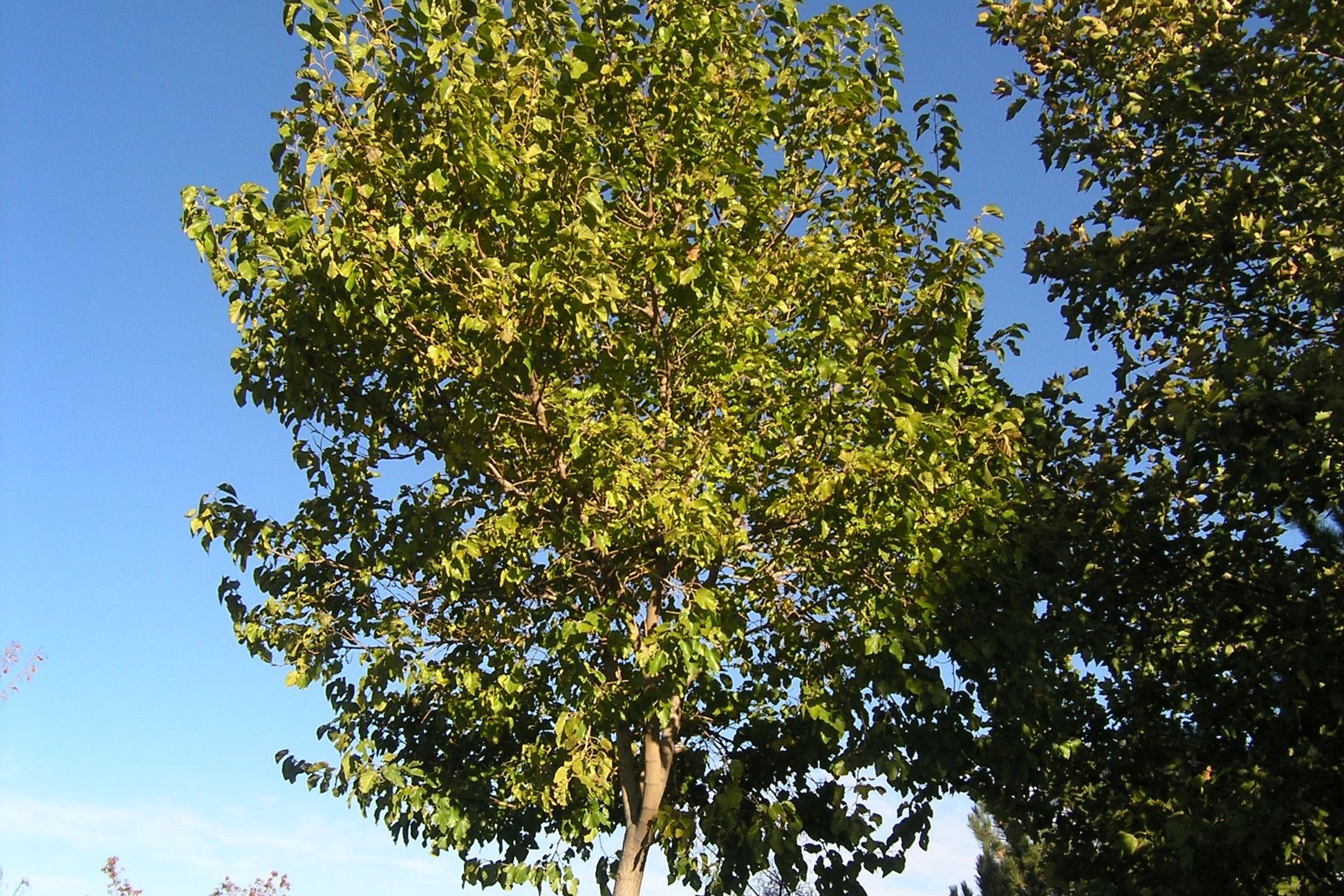 Plant Description: Vigorous spreading tree. Deeply veined leaves are large and glossy. Foliage turns yellow in the fall. Insignificant flowers appear in the spring. This cultivar is more salt and drought tolerant than the species. Adaptable to a wide range of soils and types.