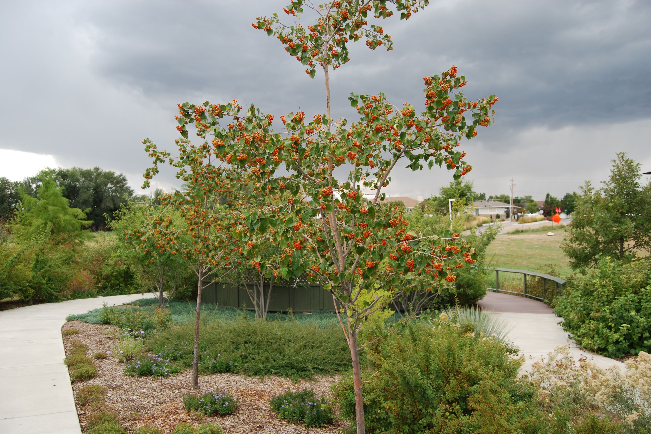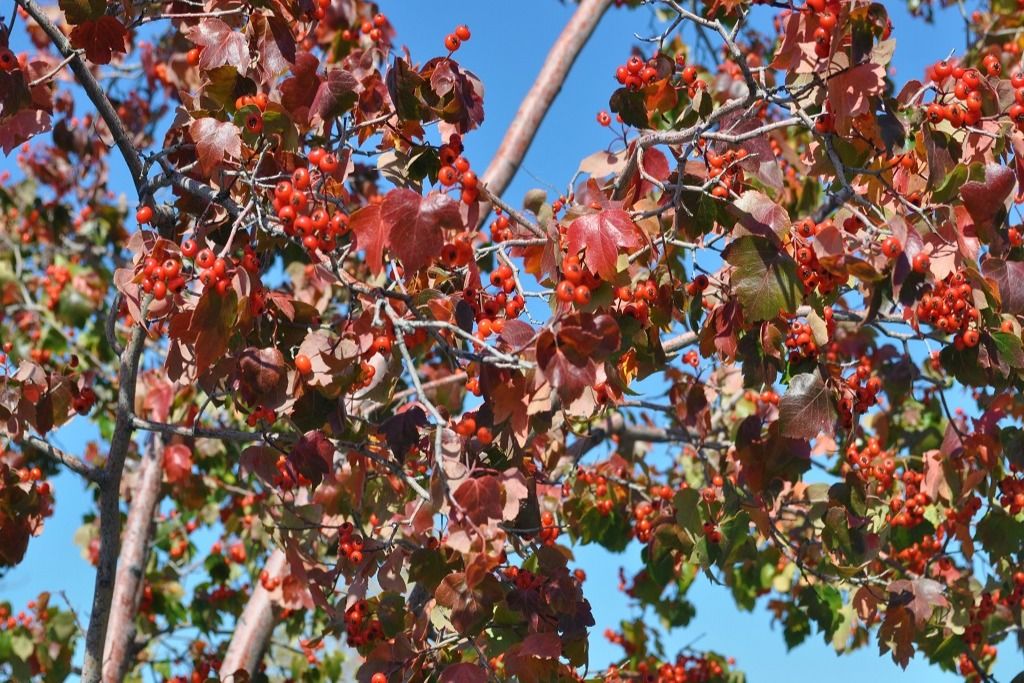 Plant Description: Small to medium pyramidally growing deciduous tree. Thorny limbs are covered with pure white flowers in the spring followed by bright red fruit that is preferred by birds. Glossy green leaves turn bright red in the fall. Works well as a specimen plant or as a screen. Can be difficult to work with due to the thorns. Tolerant of many soils and drought.