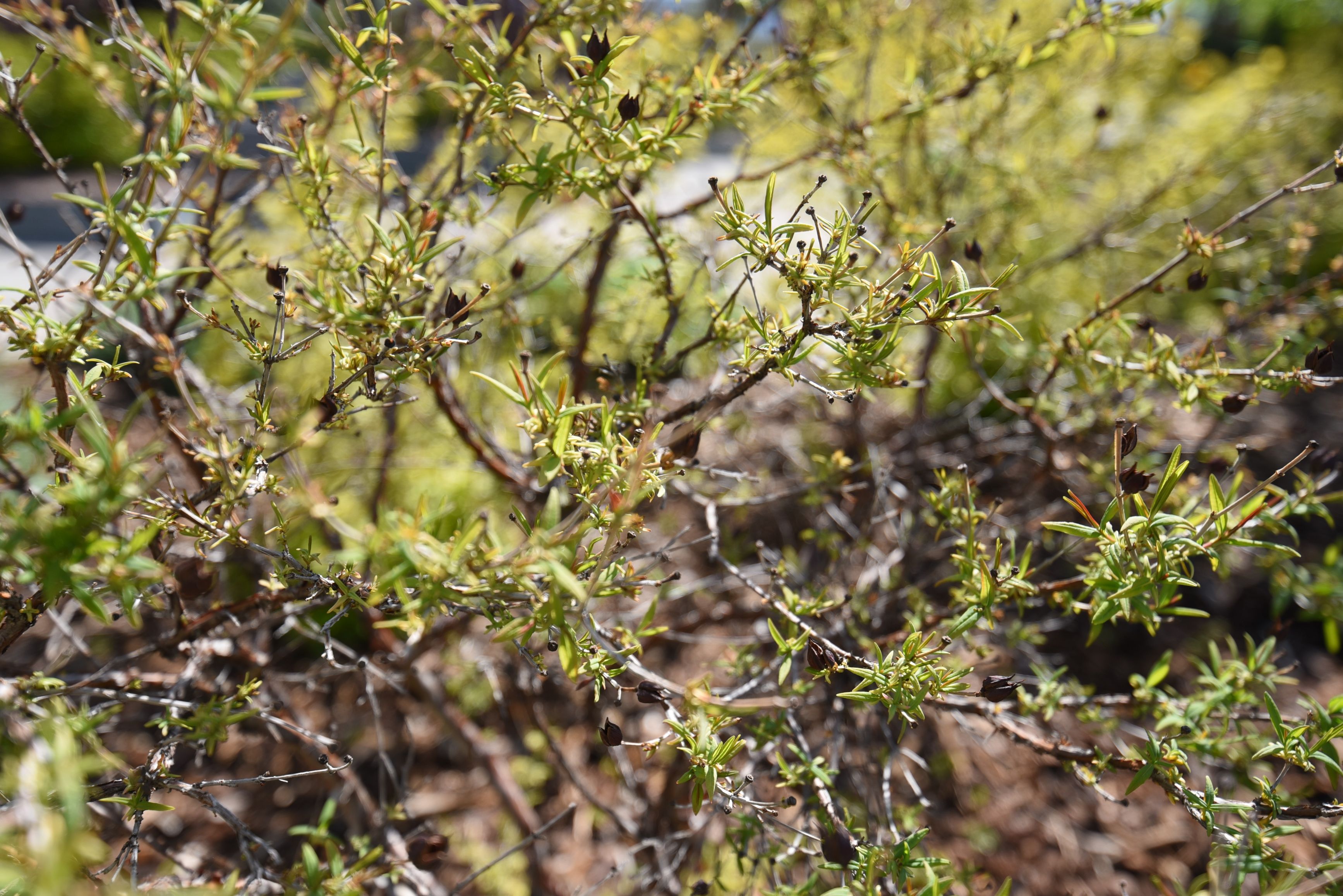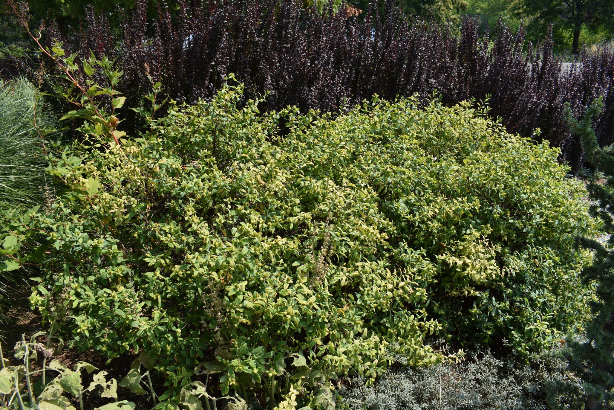 Plant Description: Dense and mounded shrubby perennial with oblong leaves. Large golden-yellow flowers bloom in early summer. Flowers are solitary and have a cluster of bushy stames in the center. Reddish-brown bark is exfoliating on mature stems. Topgrowth may not survive harsh winters but will quickly grow again from the roots. Tolerates some drought.