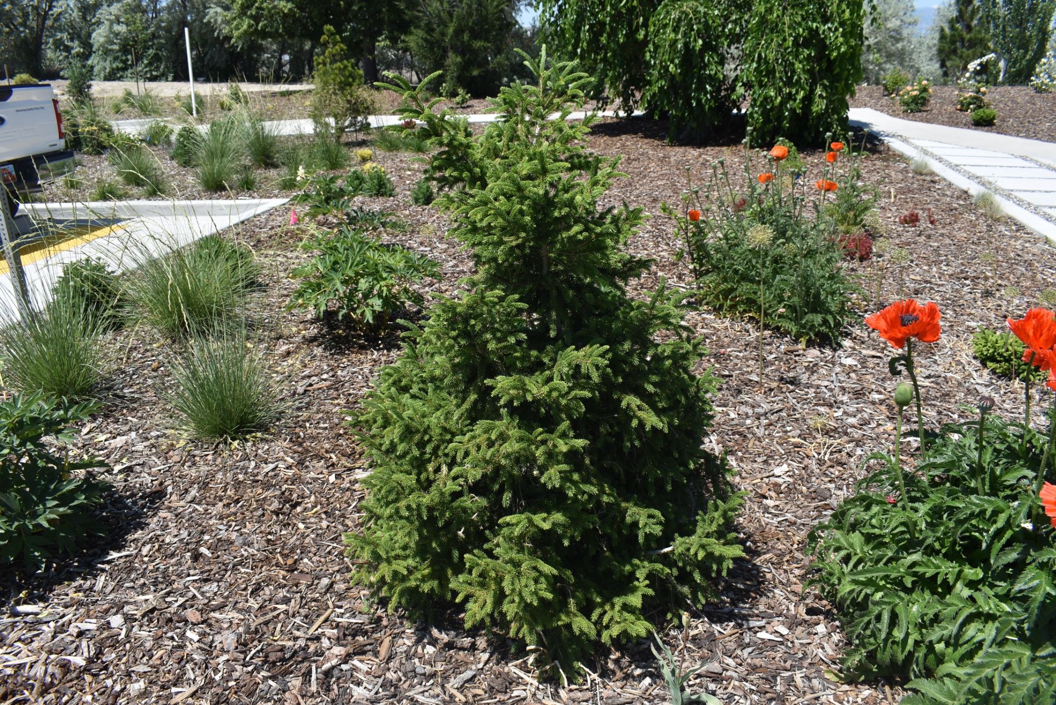Oriental spruce is a medium to large, densely-branched, narrow-pyramidal evergreen conifer. 'Gowdy' is a slow-growing columnar cultivar. Fine, dark green needles are very attractive.