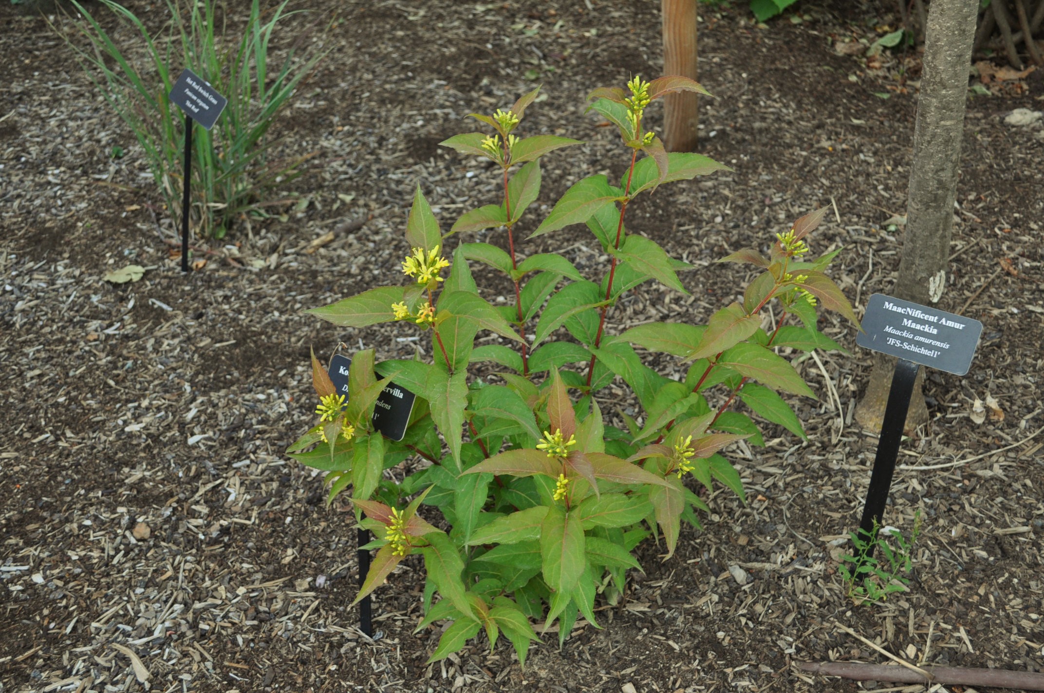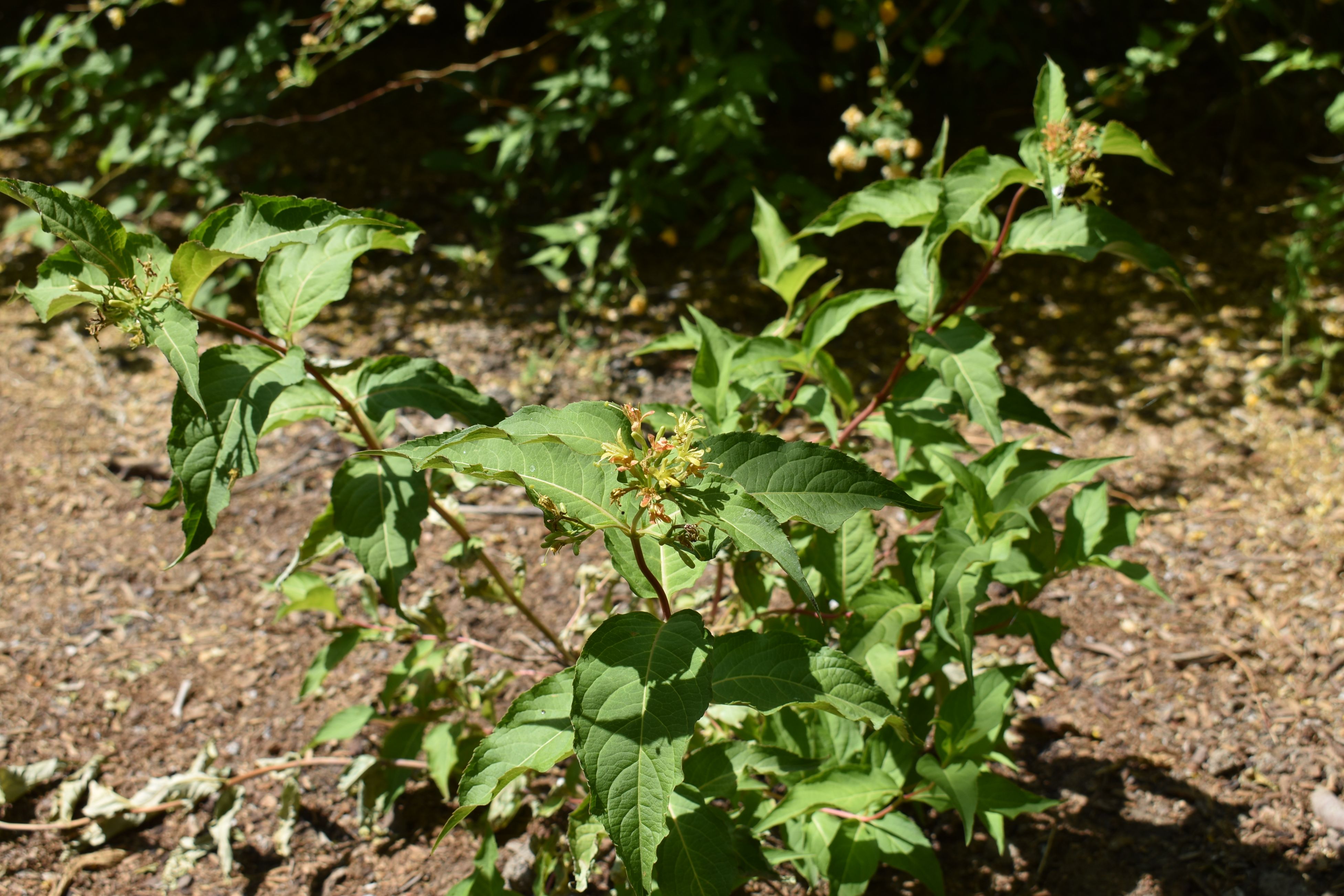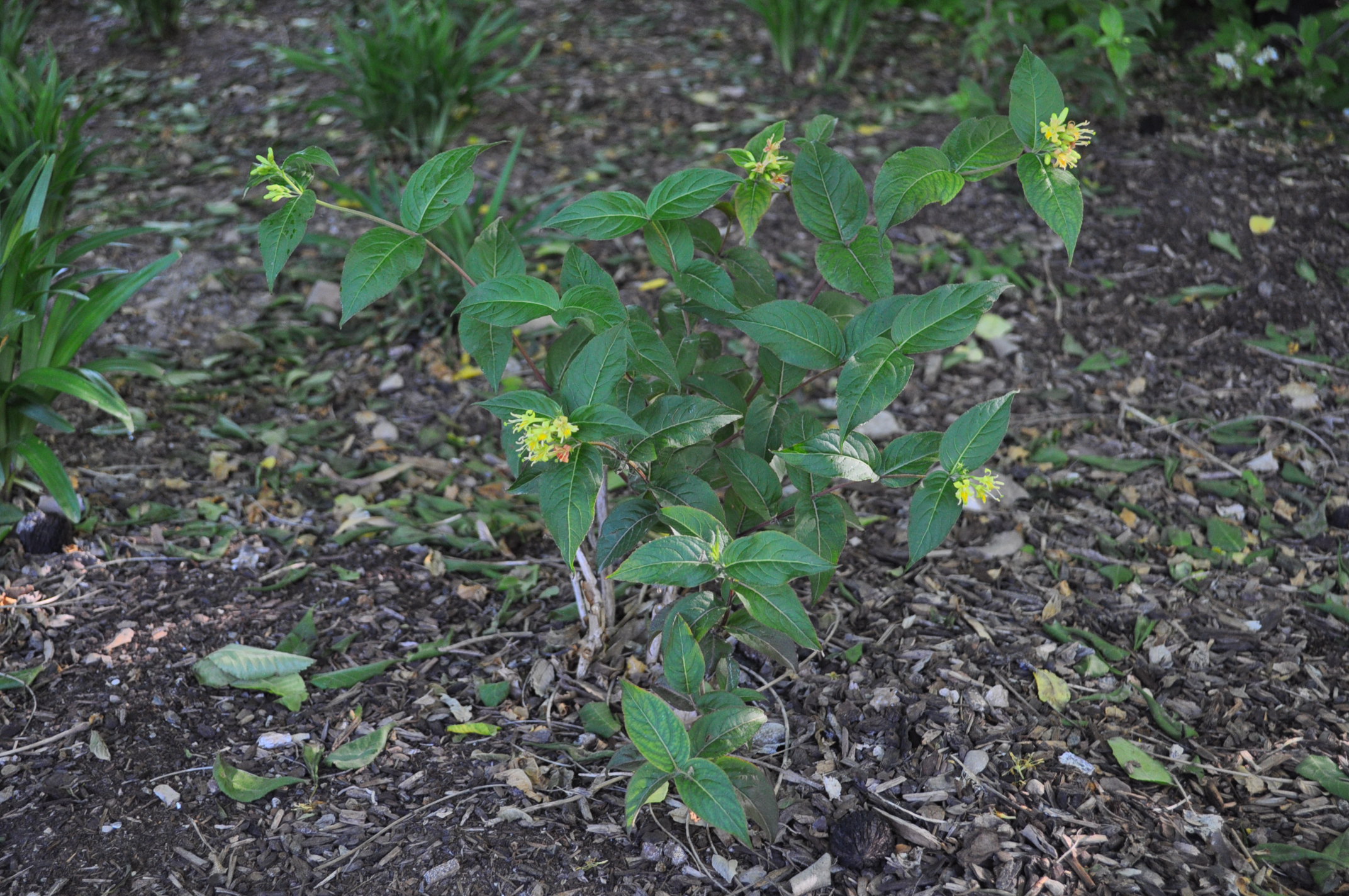 This hardy shrub, sometimes called bush honeysuckle, features burgundy-black and dark green foliage which adds striking contrast to lighter colored perennials. The leaves take on darker shades in both spring and fall, and clusters of sunshine yellow flowers stand out in the early summer. Bush honeysuckles are native to the U.S. and are a great non-invasive choice for tough spots.