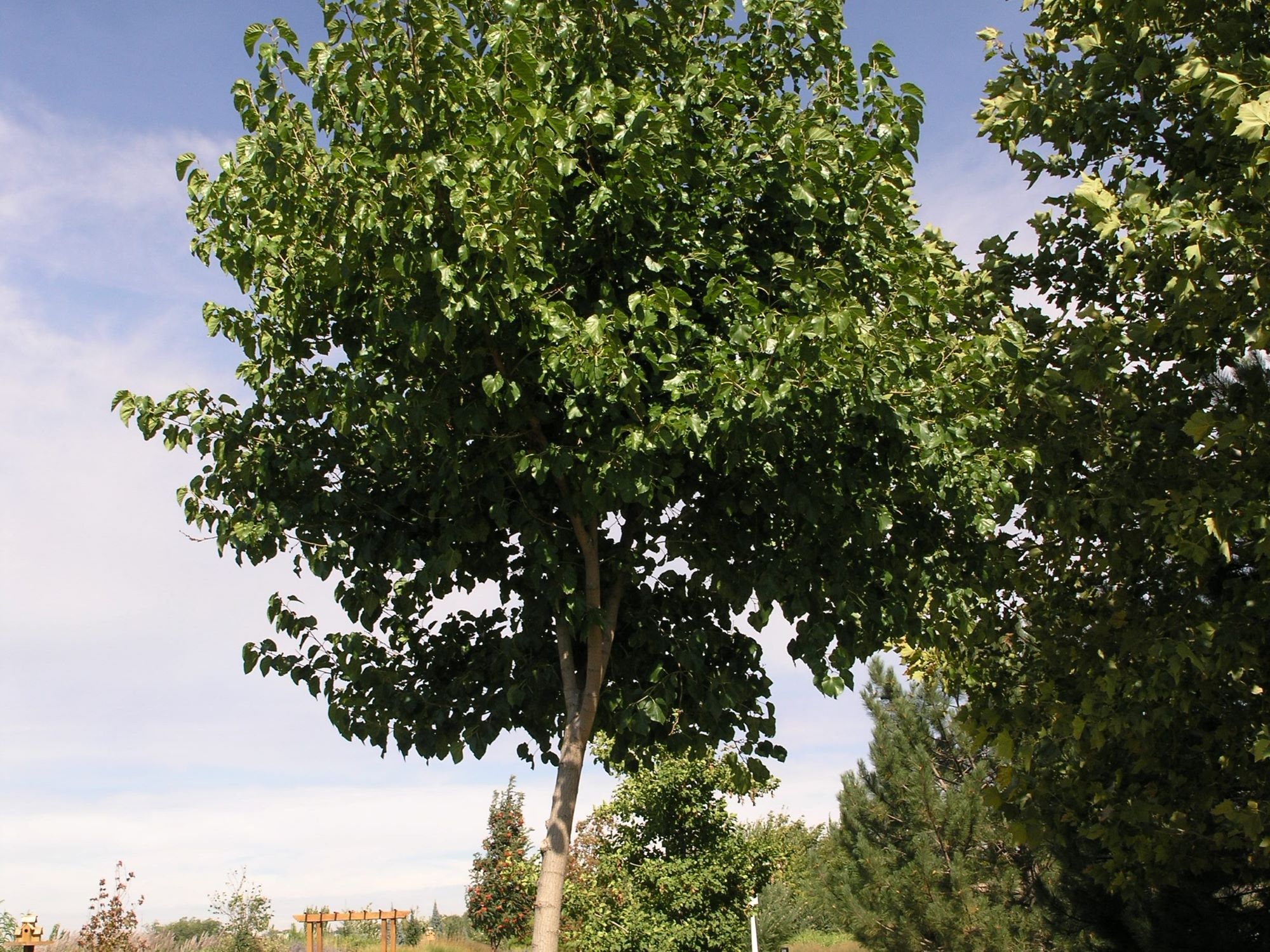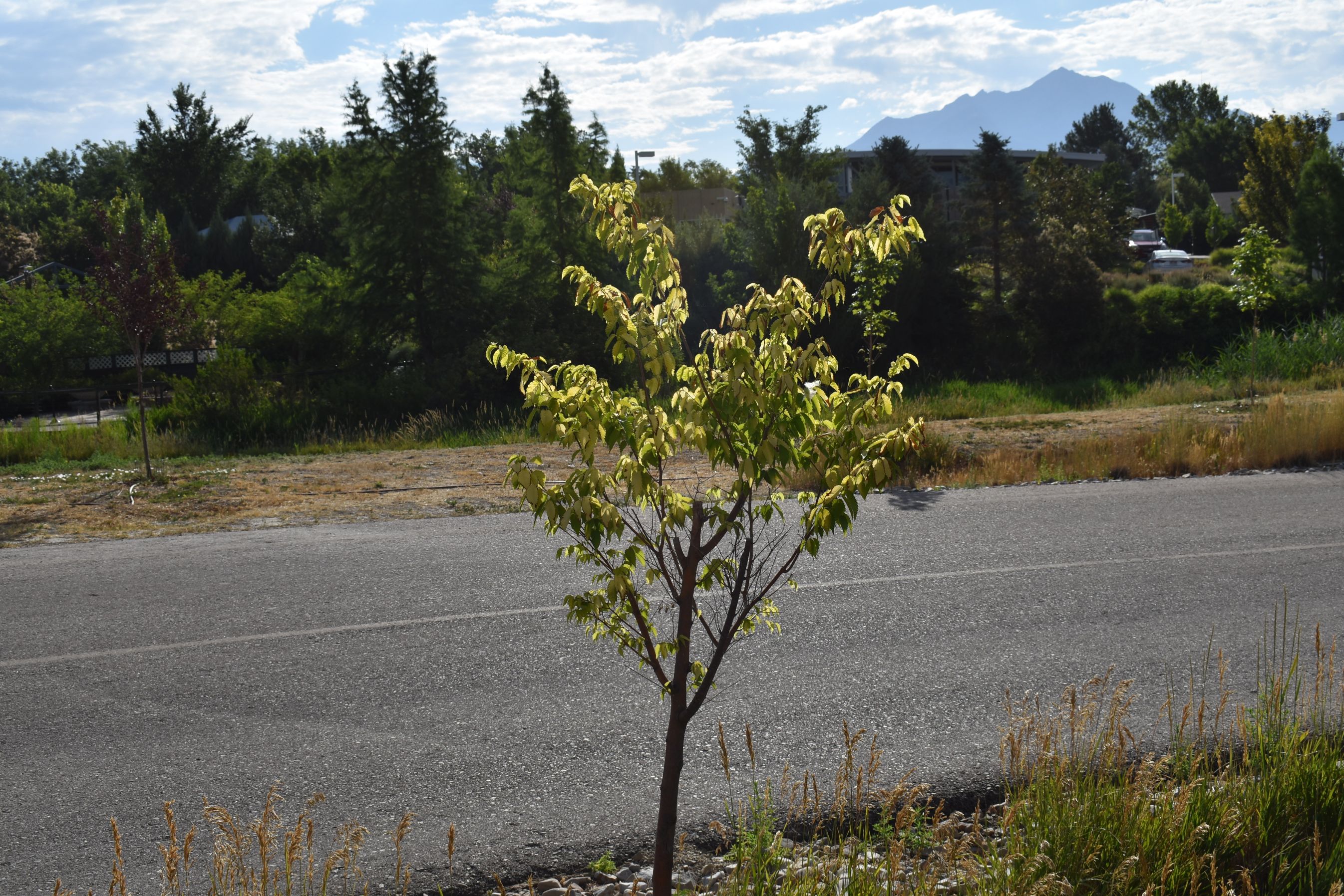 Vigorous spreading tree. Deeply veined leaves are large and glossy. Foliage turns yellow in the fall. Insignificant flowers appear in the spring. This cultivar is more salt and drought tolerant than the species. Adaptable to a wide range of soils and types.