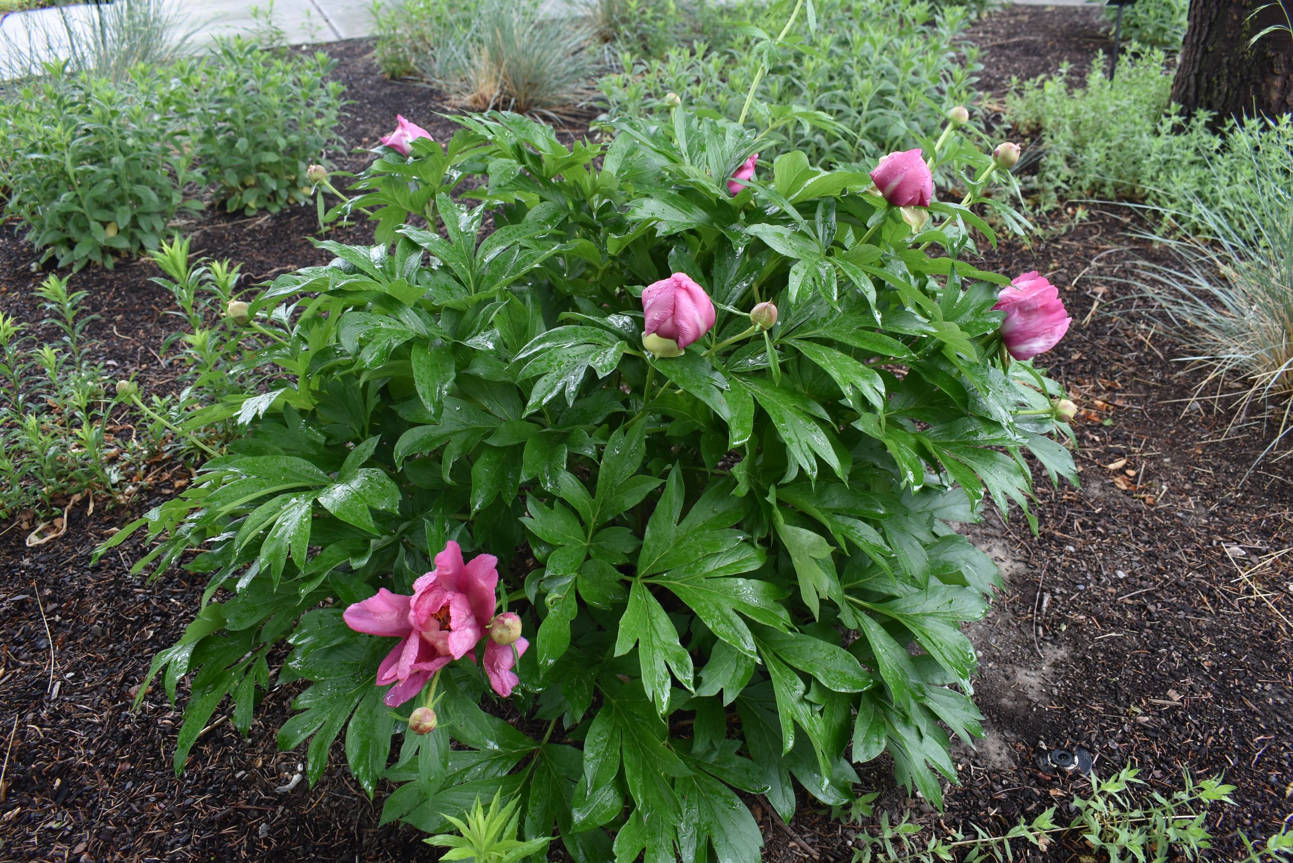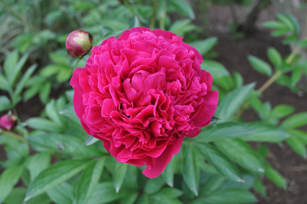 A clump-forming, herbaceous, shrubby flowering perennial. Large mildly fragrant bright double crimson flowers bloom during late-spring. Attractive deeply lobed mid-green foliage provides appeal even when not in bloom. Tolerates some drought once established.