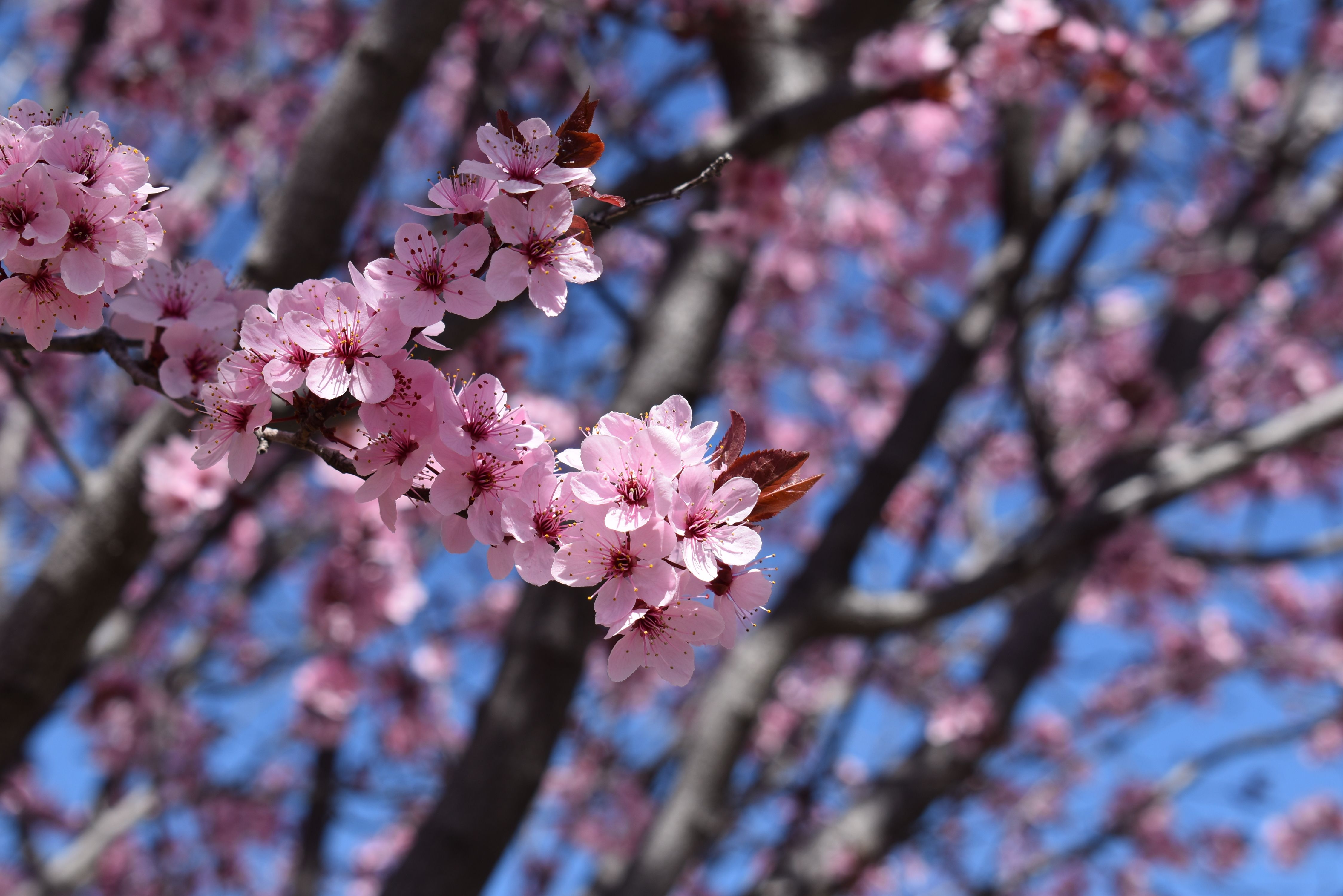 Small, flowering, deciduous tree with a rounded form. Profuse light pink flowers bloom in early-spring, one of the first to bloom. Dark purple leaves provide an excellent contrast in the landscape. Requires some early pruning to develop a good shape. May produce a few small fruits, that although edible, are better left on the tree.