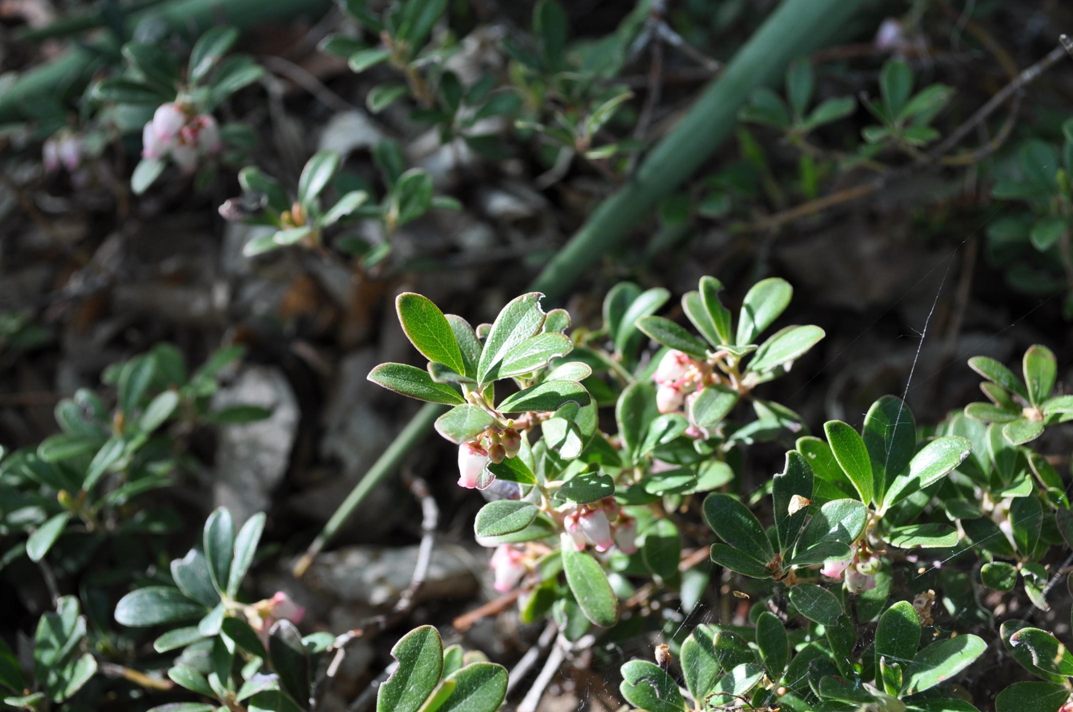Low-growing mat-forming evergreen shrub. Shiny leathery dark green leaves may become reddish-brown during the winter. White flowers tinged with pink appear in spring. Red berries are eaten by birds but not recommended for human consumption. Extremely winter hardy. Tolerates poor soil.
