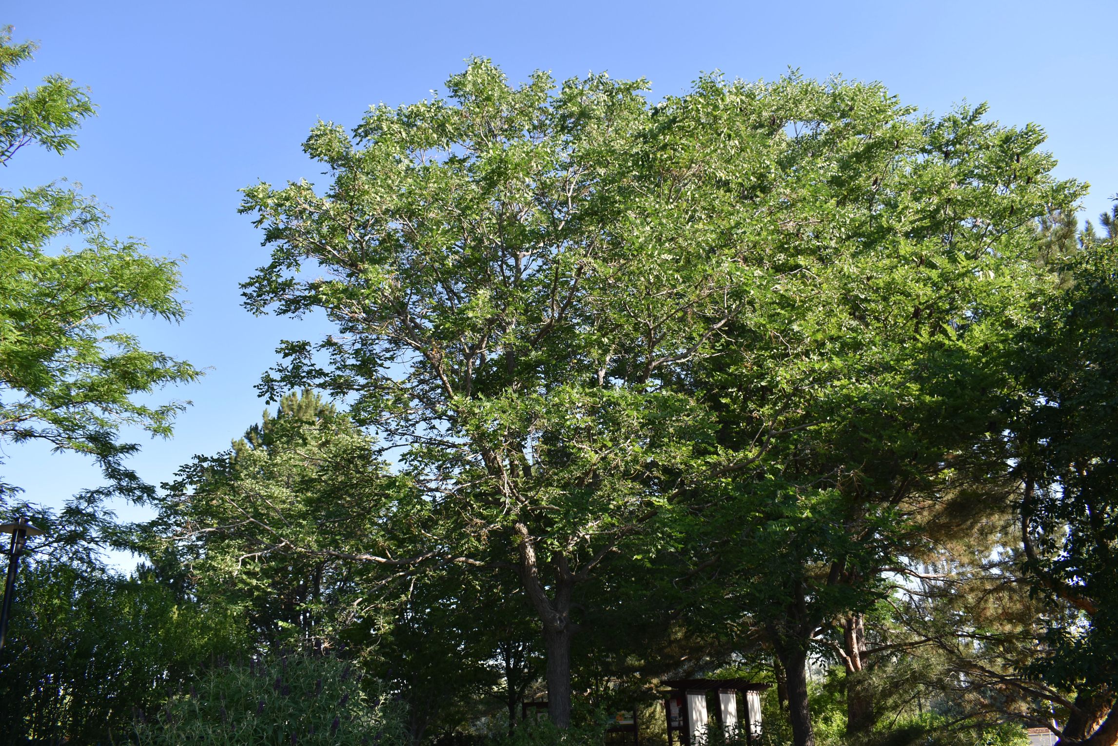 Very tall deciduous tree with an oval crown shape. Native to east and central North America. Large leaves are made up of small green leaflets. Large panicles of inconspicuous whitish green star-shaped flowers appear in late-spring. Large brown seed pods follow which will require some clean-up. Very tolerant of alkaline and infertile soils. Drought tolerant once established. Can become a very large tree so allow room to grow.