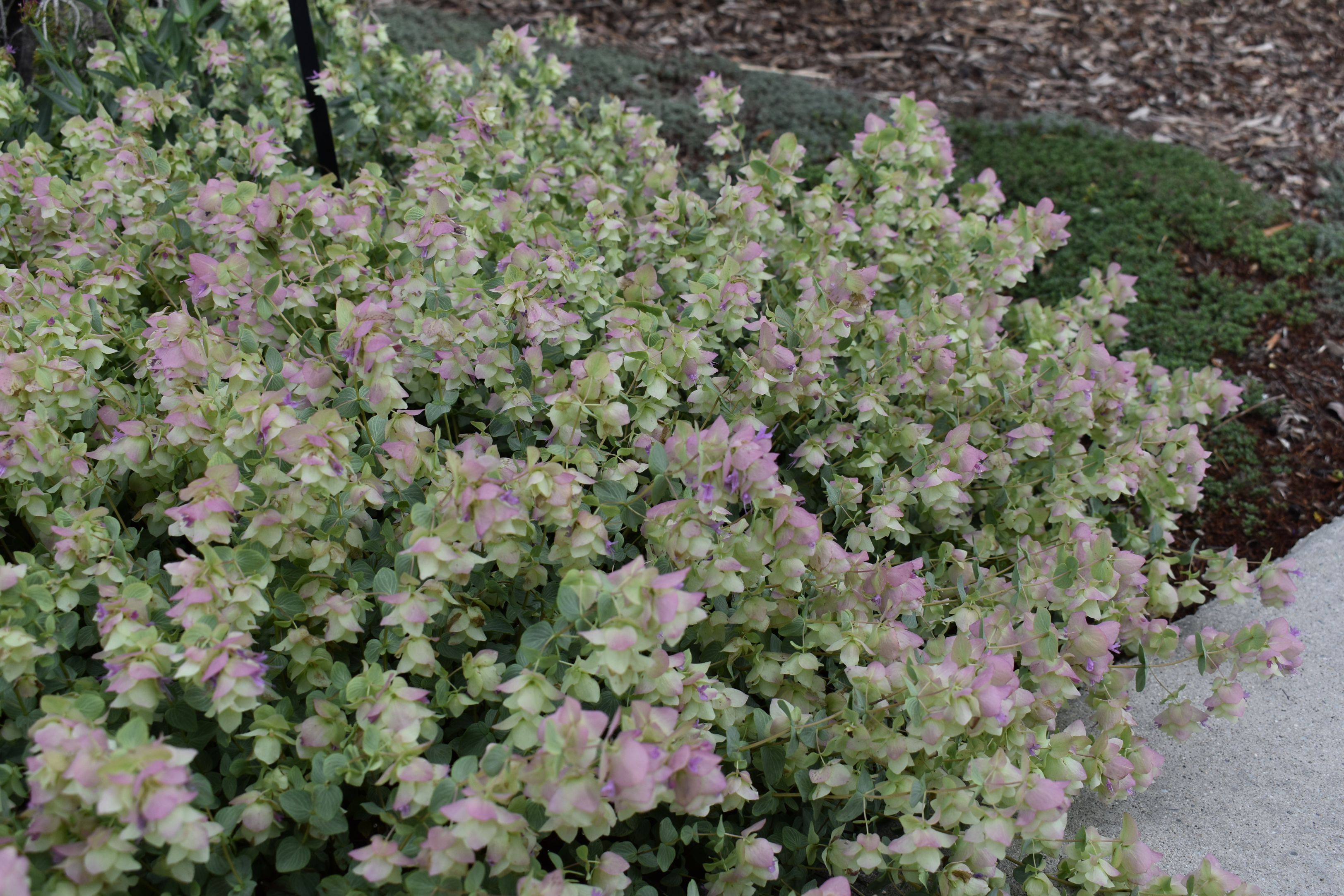 Trailing semi-evergreen perennial. Not reliably winter hardy. Grown primarily for ornamental and not culinary purposes. Bright green leaves are aromatic but not to the same degree as culinary oregano. Cascades of blushing pink hop-like flowers bloom beginning in June continuing into the early-fall. Drought and heat tolerant.
