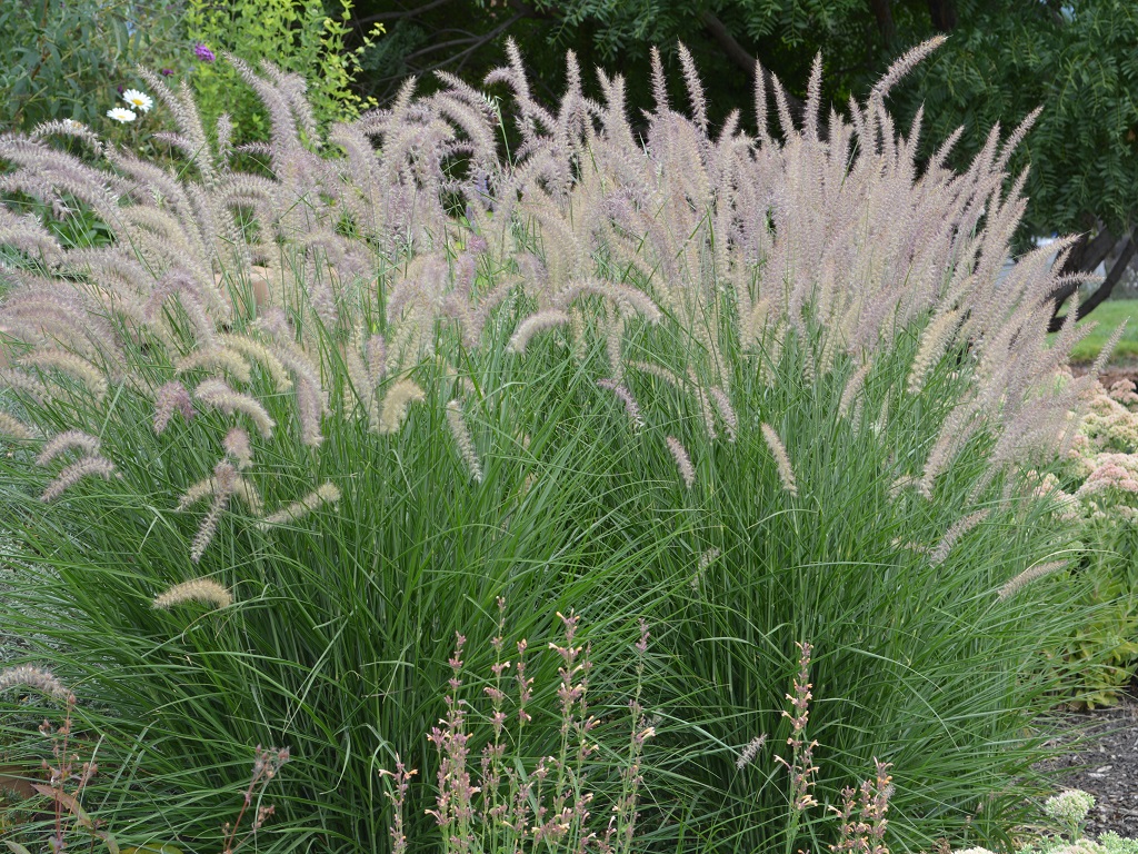 Dense, clump-forming, perennial grass with foxtail-like inflorescences and narrow leaves. Rose-purple wisps begin blooming in June. Very attractive foxtails last into fall. Prefers full sun. Moderately drought tolerant.