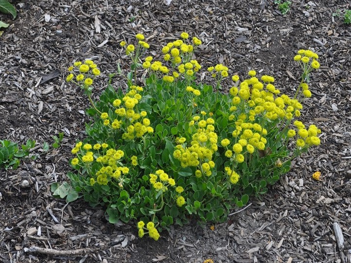 This Plant Select winning native perennial spreads into a mat of slightly silver-edged, gray-green leaves. Flowering begins in late spring or early summer and lasts through fall, with showy bunches of cream to sulfur yellow flowers that age to rusty orange. Foliage turns a rich burgundy in the fall and remains attractive through the winter. Prefers moderate to dry well-drained soil, do not overwater.