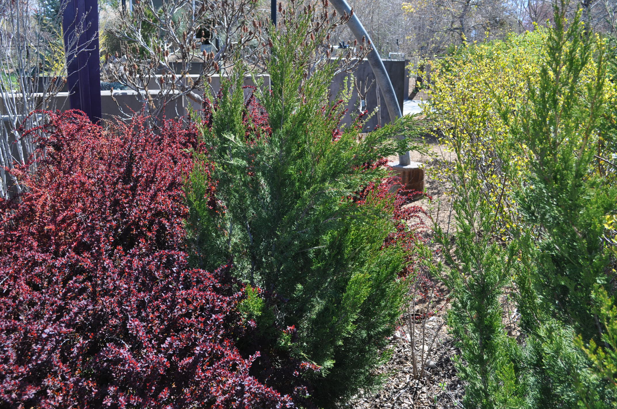 Large evergreen shrub with picturesque and open form. Tightly growing scale-like green leaves grow on upward-twisting branches that may lean to one side in maturity. Requires little to no pruning and does not create a uniform hedge due to varying forms. Tolerates alkaline soils and drought.