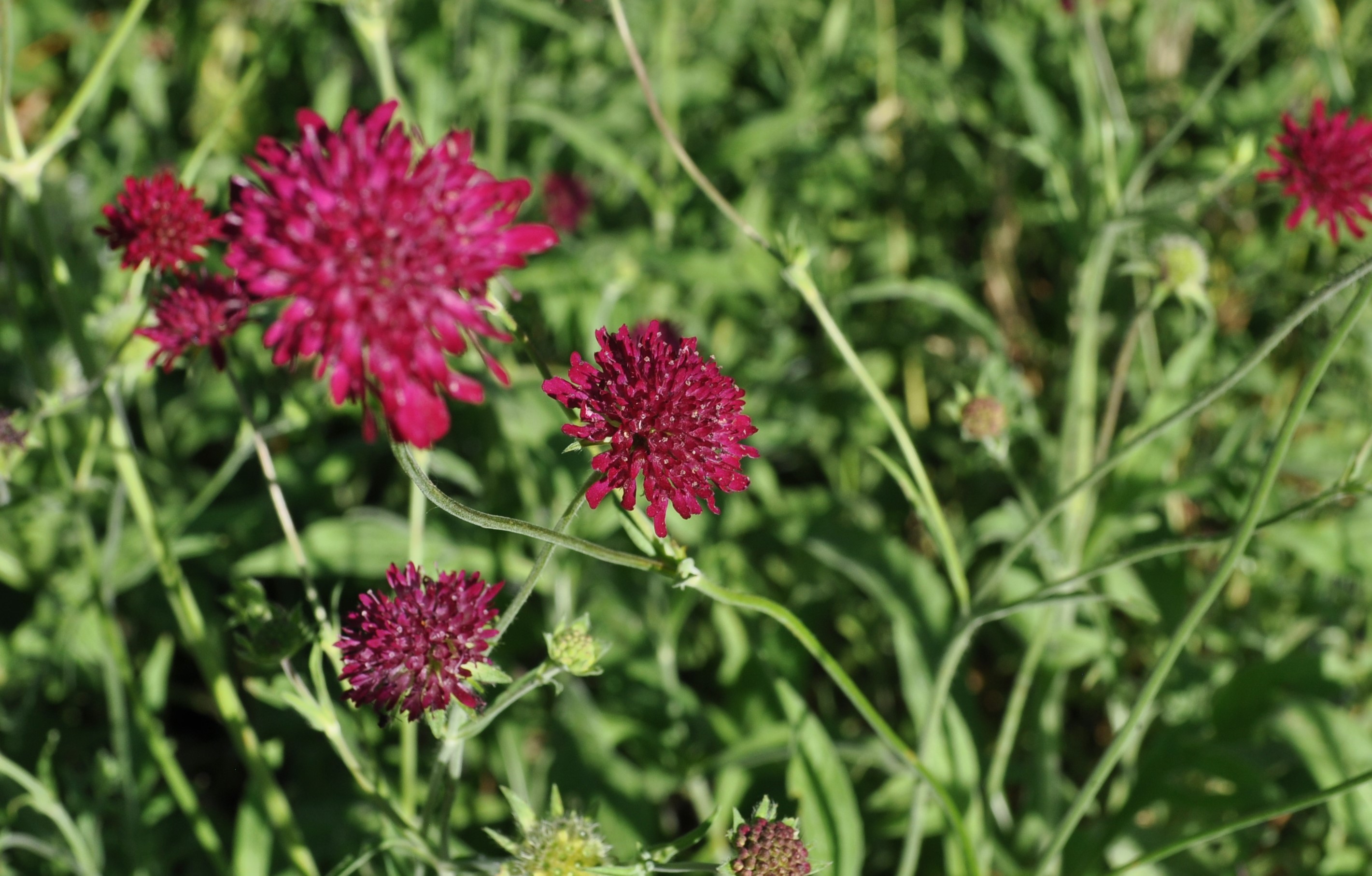 Loose clump-forming perennial with numerous long lasting crimson-red, pincushion-like flowerheads that bloom on slender, branched stems from early summer to frost (with deadheading). Prefers full sun in well-drained soil.